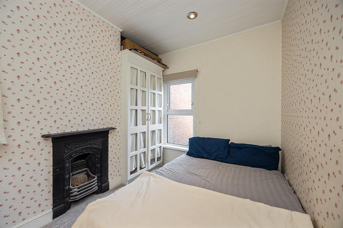 Feature cast iron fireplace and built in robe to either side.