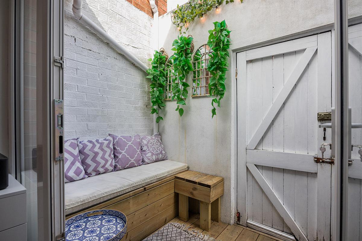 Rear Decked yard with fitted seating and storage cupboard with gas fired boiler.