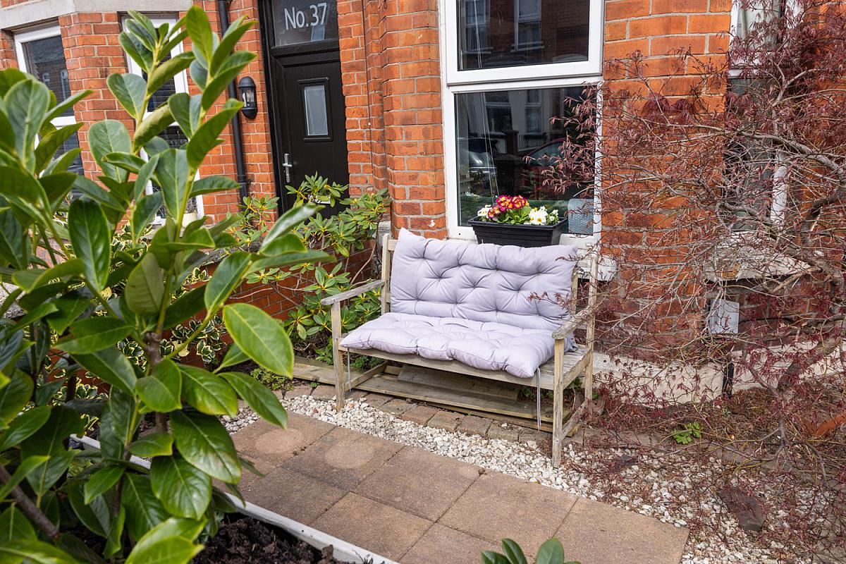Front forecourt garden with sitting area with trees and shrubs and boundary wall.