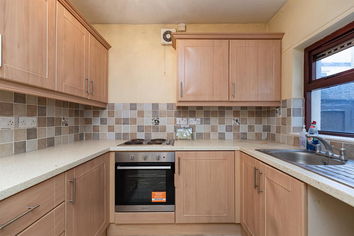 Range of high and low level units, single drainer stainless steel sink unit, part tiled walls, Indesit stainless steel oven, four ring stainless steel hob, plumbing for washing machine. Storage cupboard under stairs. Door to rear.