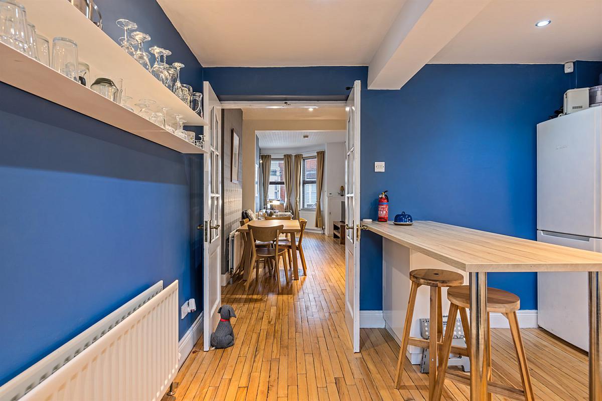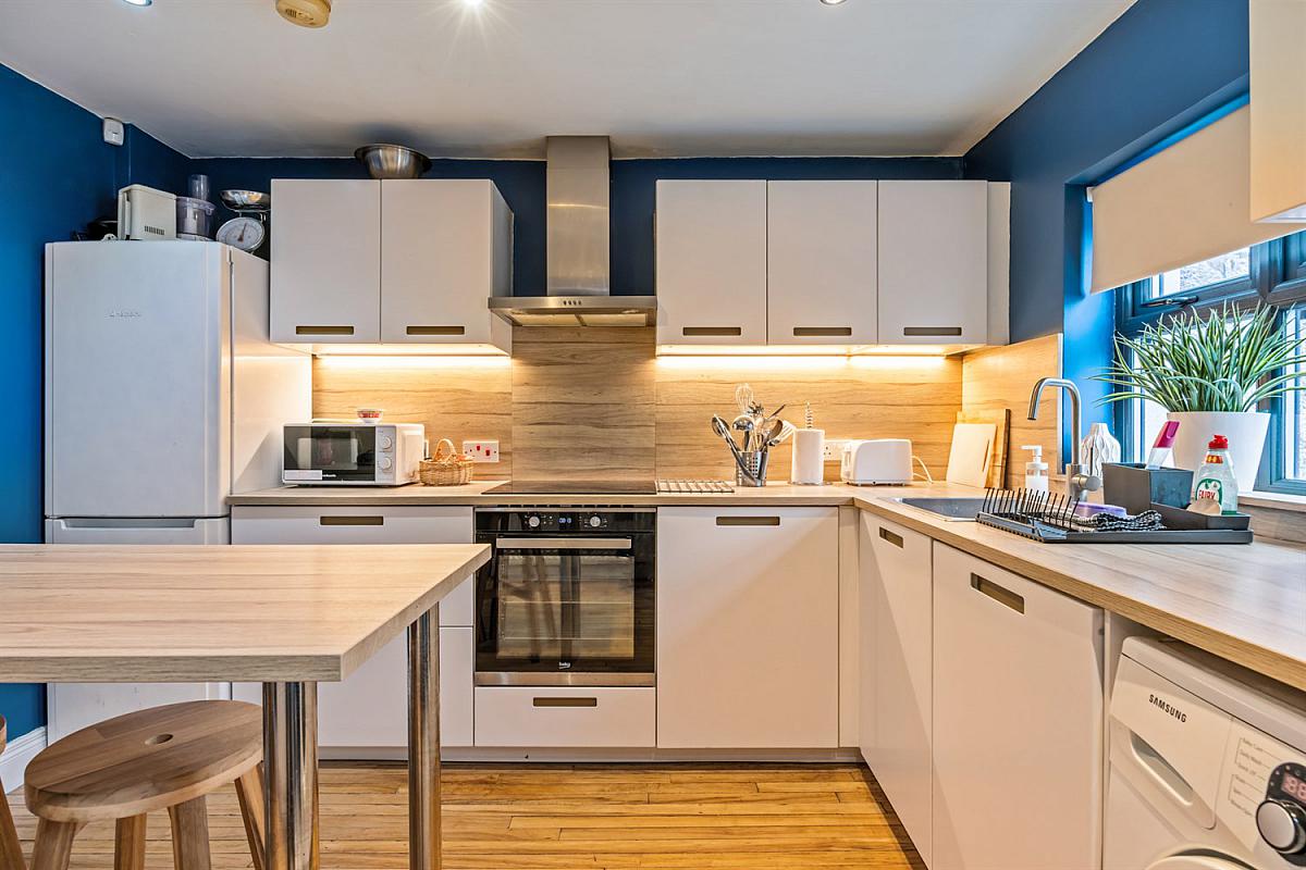 Excellent range of high and low level units in matt white finish. Wood effect worktop surfaces and upstand, extending to breakfast bar with seating area and storage. Stainless steel sink unit with mixer taps, integrated 4 ring ceramic hob with stainless steel extractor fan, electric under oven, integrated dishwasher, plumbed for washing machine. Wood strip floor. PVC door to rear patio garden.