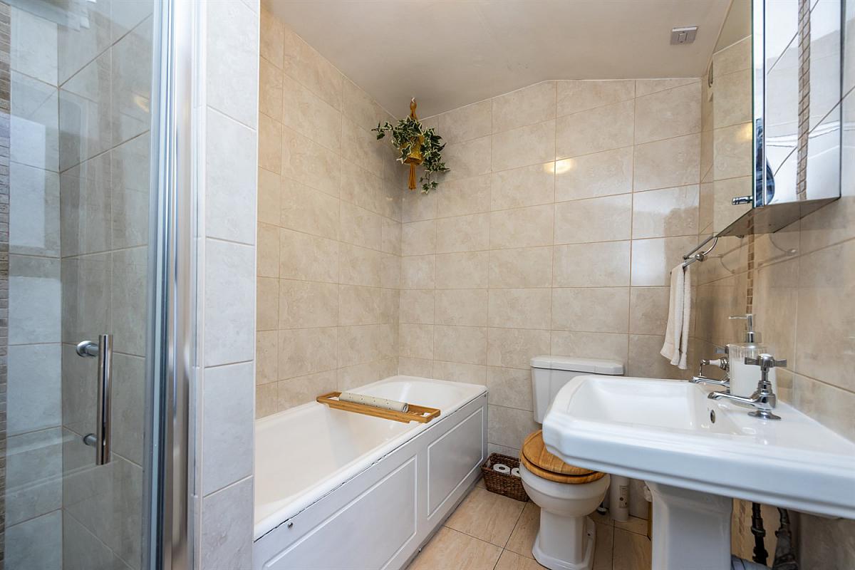 White bathroom suite including; panel bath, fully tiled shower enclosure, pedestal wash hand basin, low flush W.C. Fully tiled walls and floor.