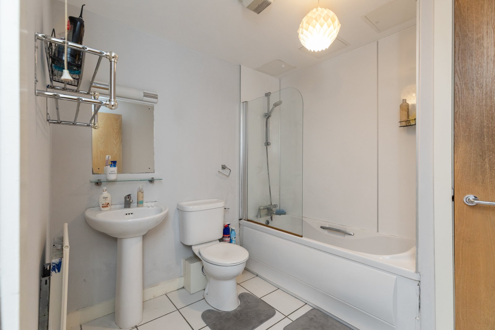 Ceramic tiled floor, low flush WC, pedestal wash hand basin, corner shower cubicle, extractor fan