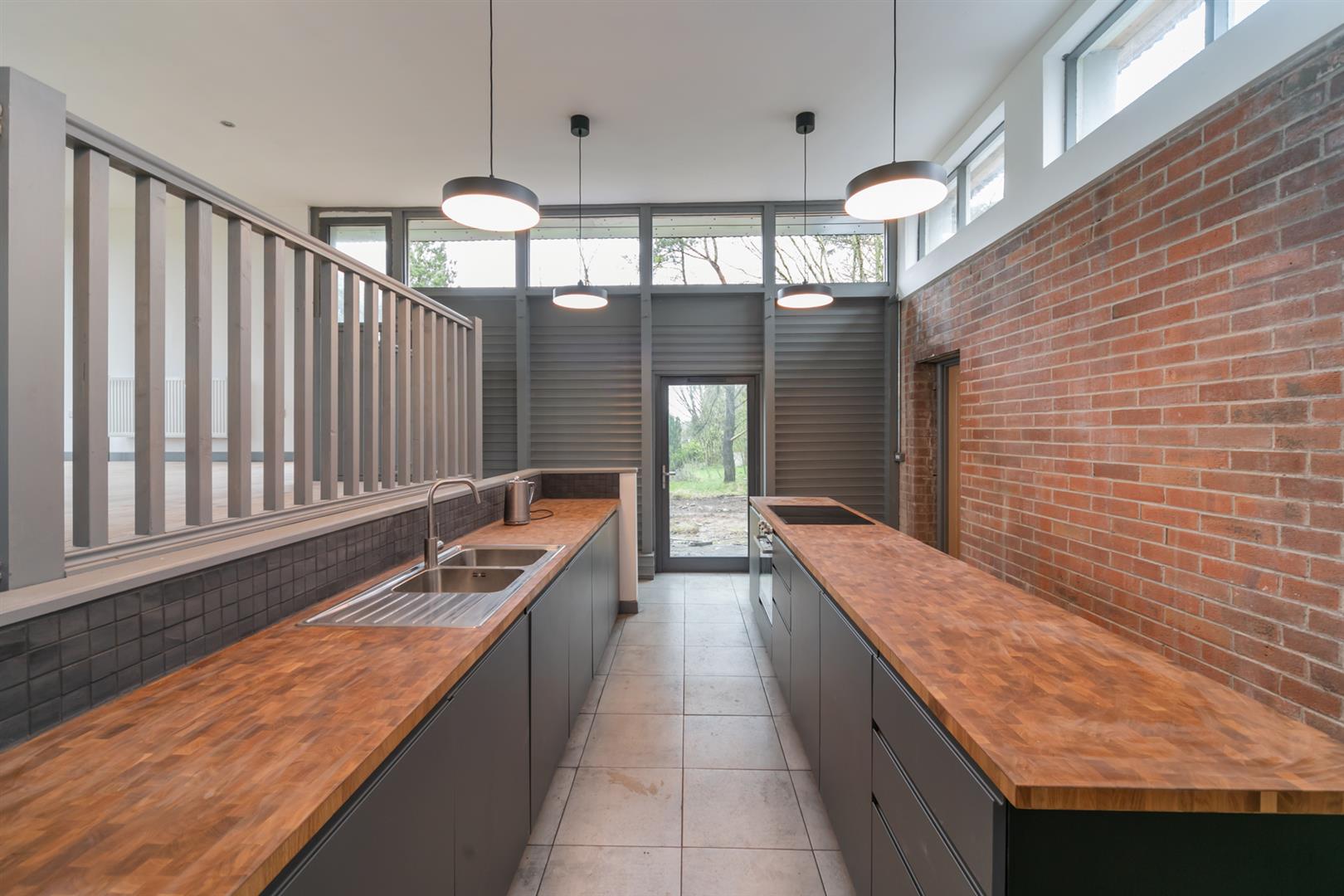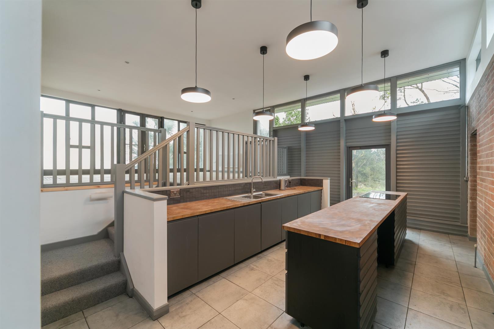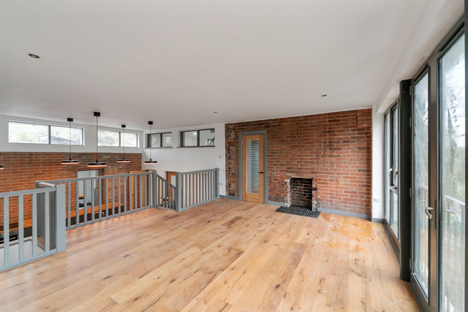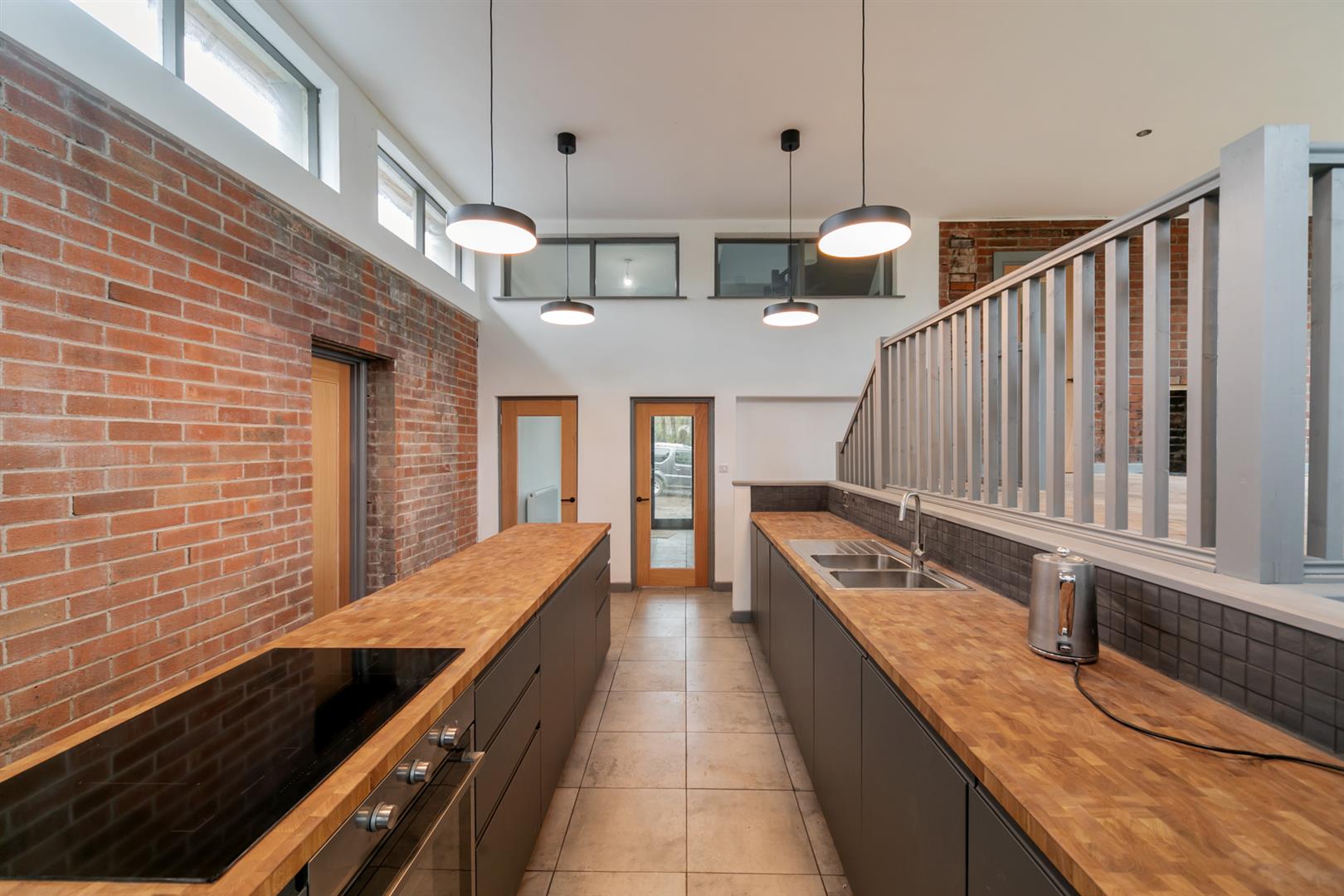 Open plan kitchen/dining/living area; split level with steps up to raised living area. On lower level contemporary kitchen with range of low rise units with stainless steel sink and drainer and tiled splash backs and wooden work tops. Large island unit with electric oven and hob. Door to side. On upper level living area with feature red brick wall and fireplace. Wooden flooring. Double patio doors with juliet balcony with stunning countryside views. Door to dining room.
