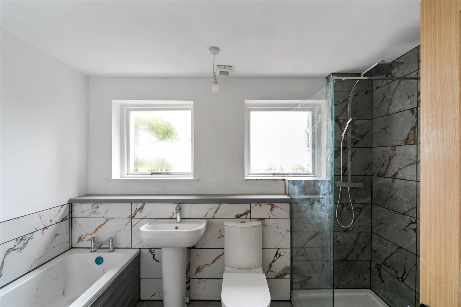 White suite encompassing low flush W/C, wash hand basin, bath and separate shower. Tiled walls and floor.