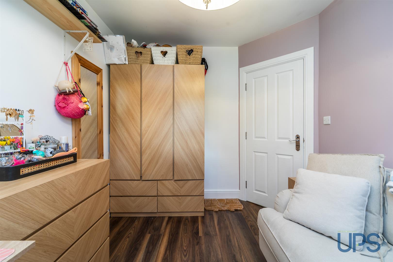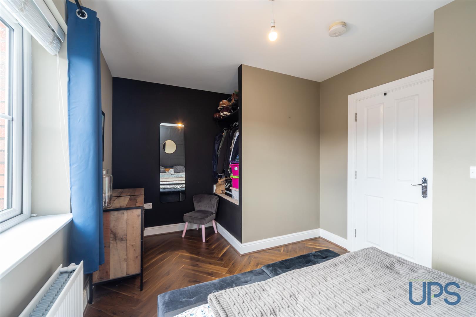 Three well-proportioned bedrooms, with a principal bedroom featuring upgraded herringbone-effect wood flooring, wood paneling, and an open wardrobe/dressing area.
