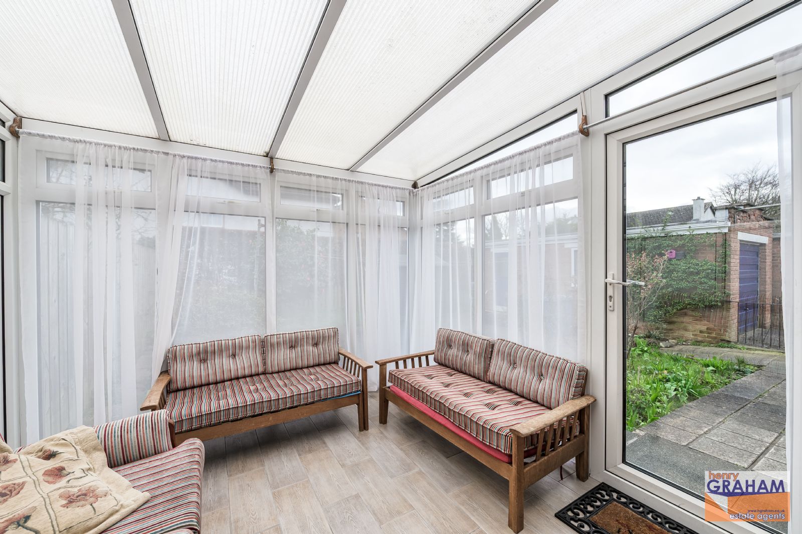 Conservatory With Wood Effect Tiled Floor And PVC Double Glazed Door To Rear Patio Garden