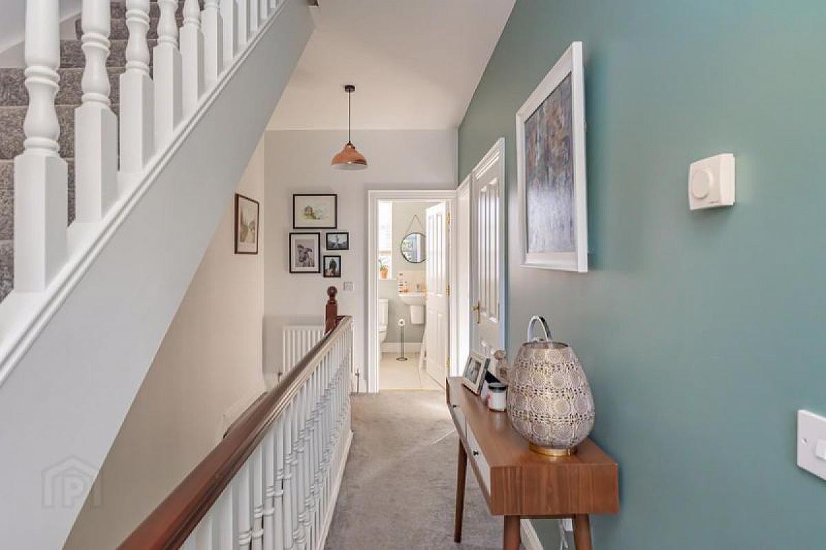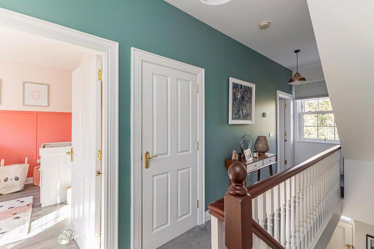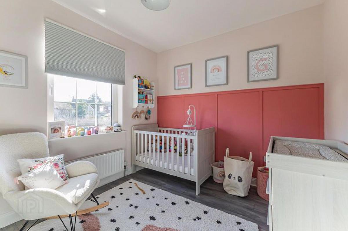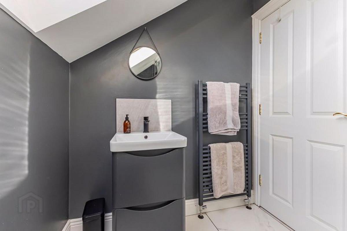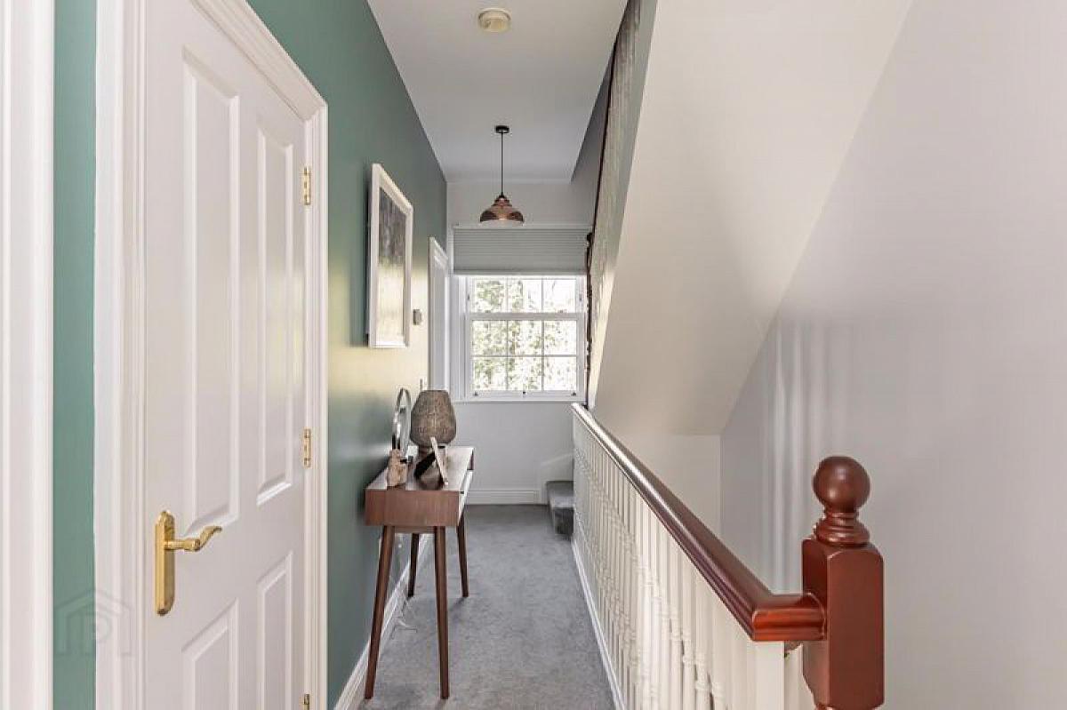 Feature wall panelling, laminate wooden floor, built-in storage cupboard, hotpress, double panel radiator.