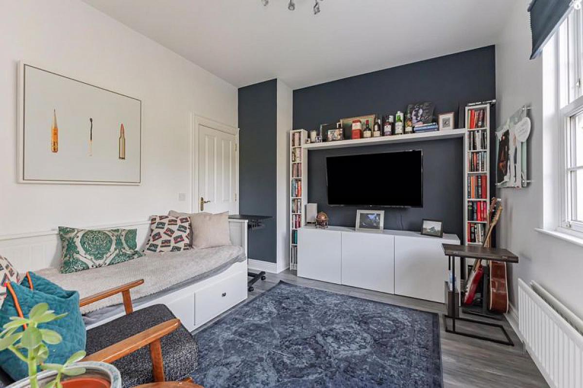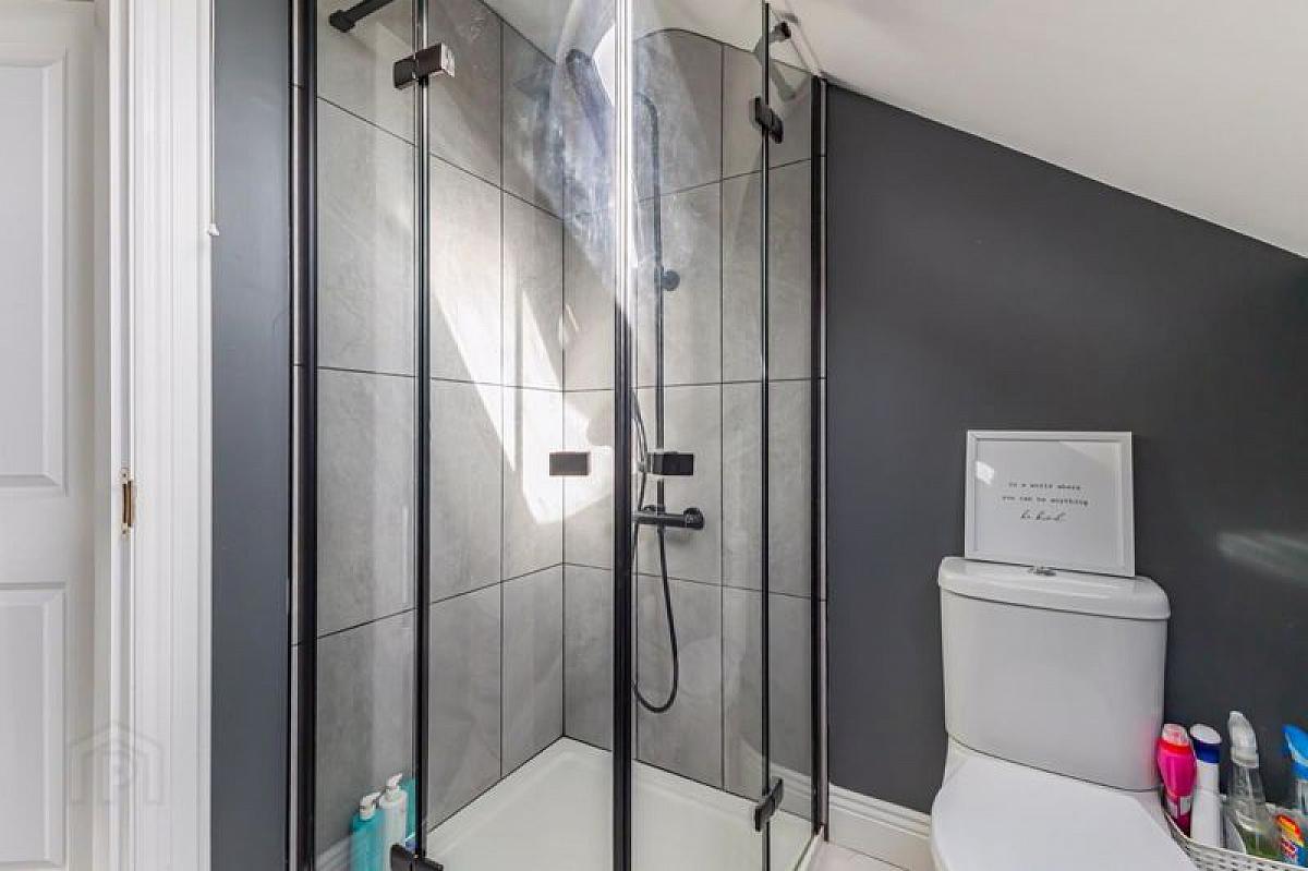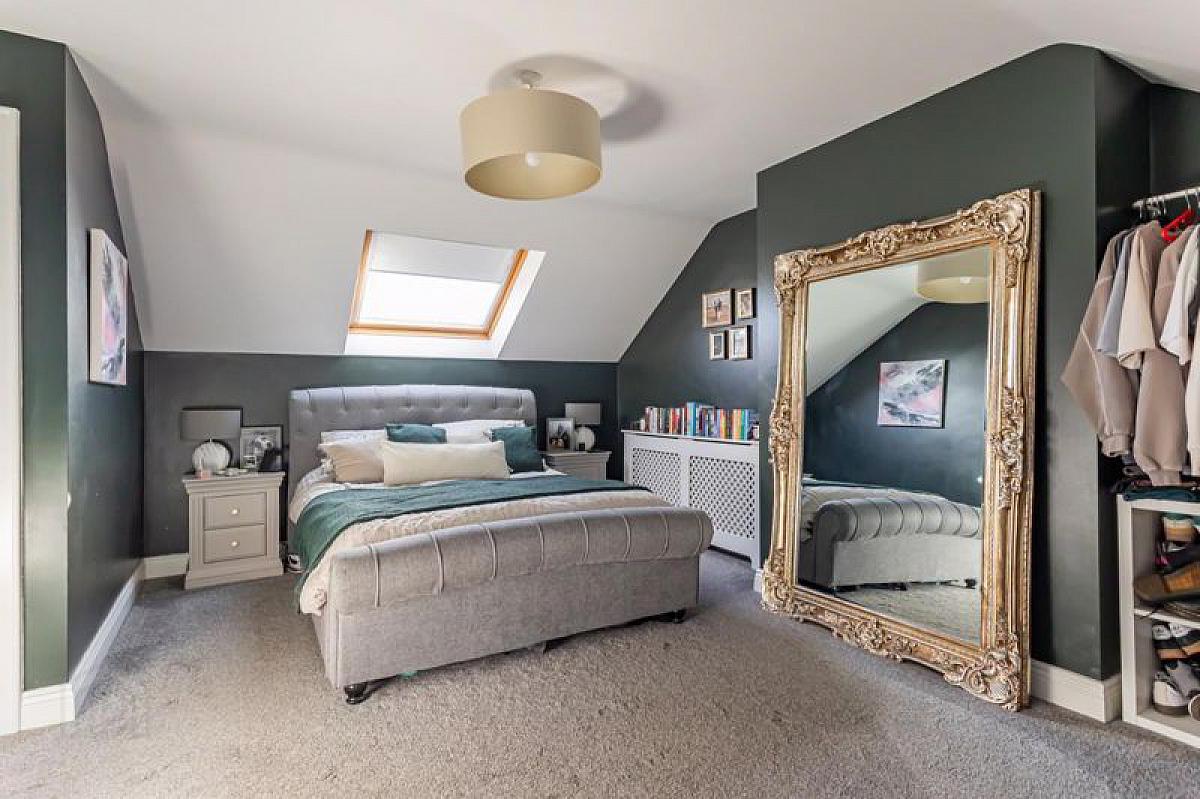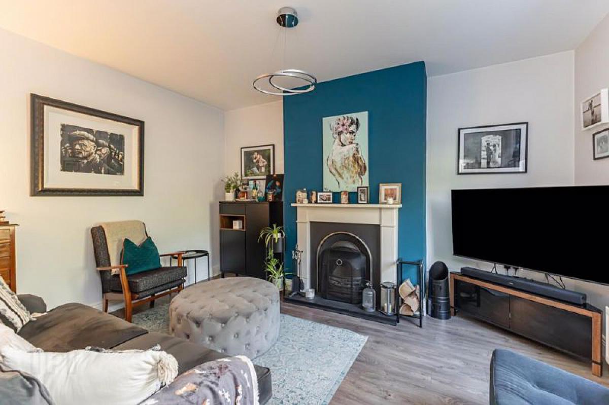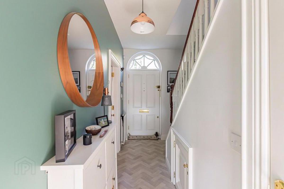 Feature wall panelling, laminate wooden floor, built-in storage cupboard, hotpress, double panel radiator.