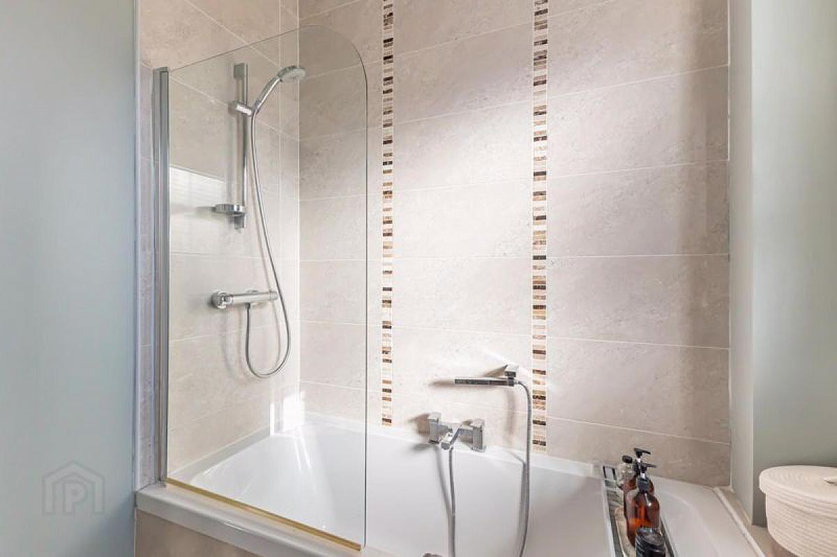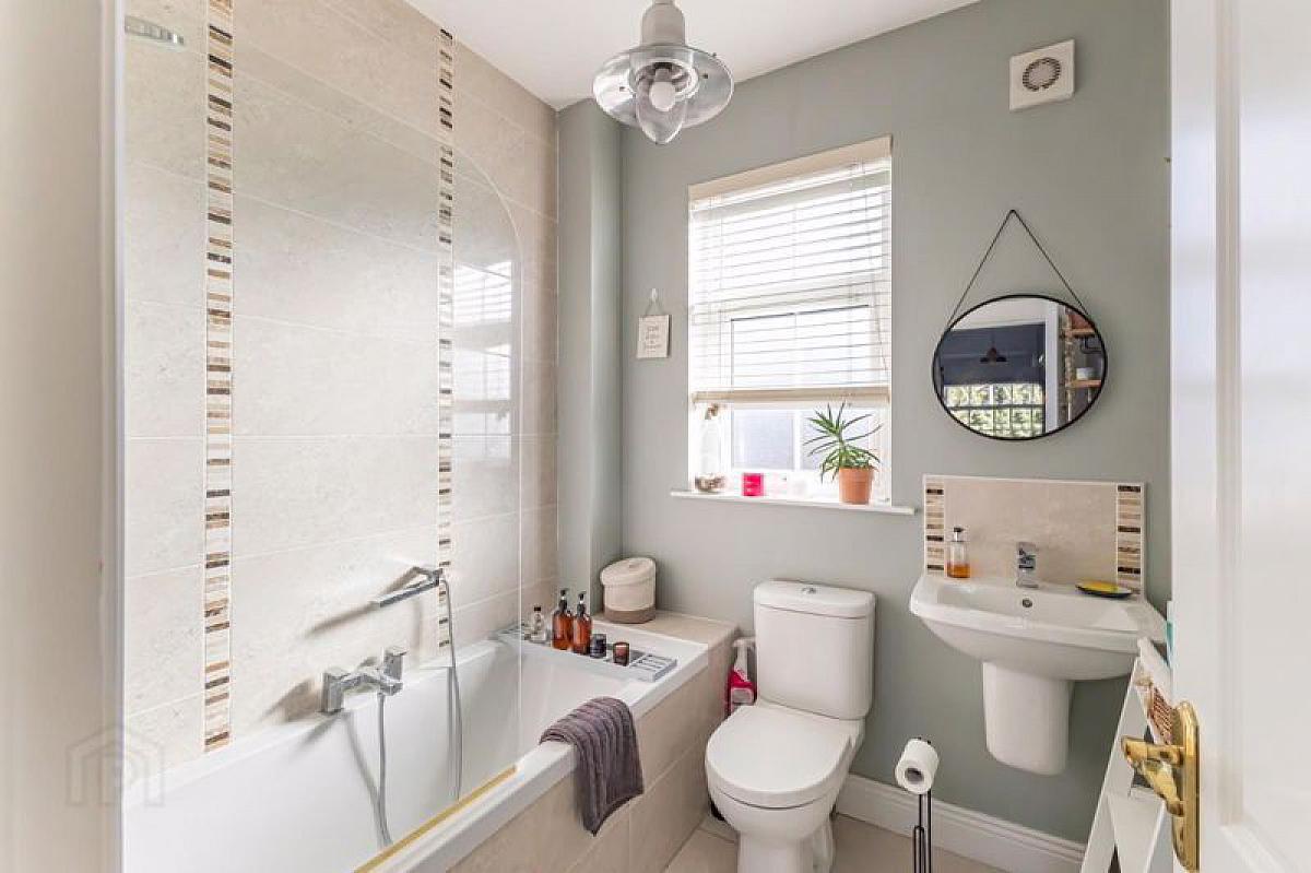 White suite comprising low flush WC, semi-pedestal wash hand basin and tiled bath with mixer tap mixer shower, part tiled walls, ceramic tiled floor, radiator.