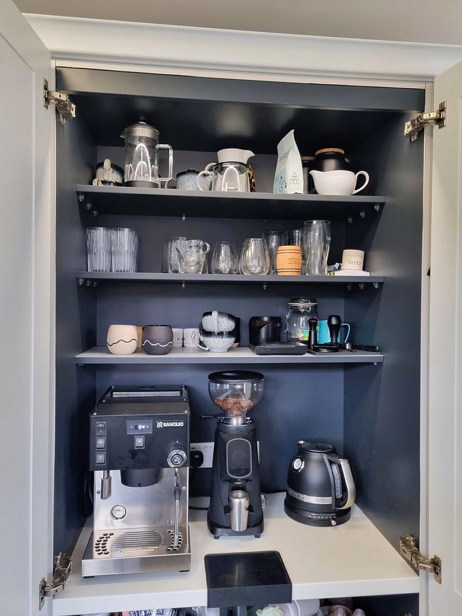 Extensive range of high and low level units with complementary worksurfaces and splashback, built-in gas hob and oven with extractor fan, integrated fridge/freezer, integrated dishwasher, built-in larder with light and power for coffee station, uPVC french doors, double panel radiator.