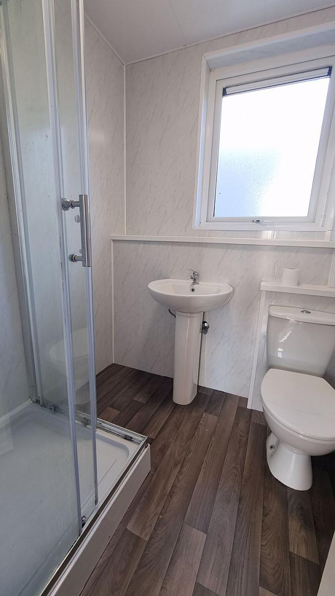 White suite comprising low flush WC, pedestal wash hand basin and shower cubicle with electric shower, heated towel rail.