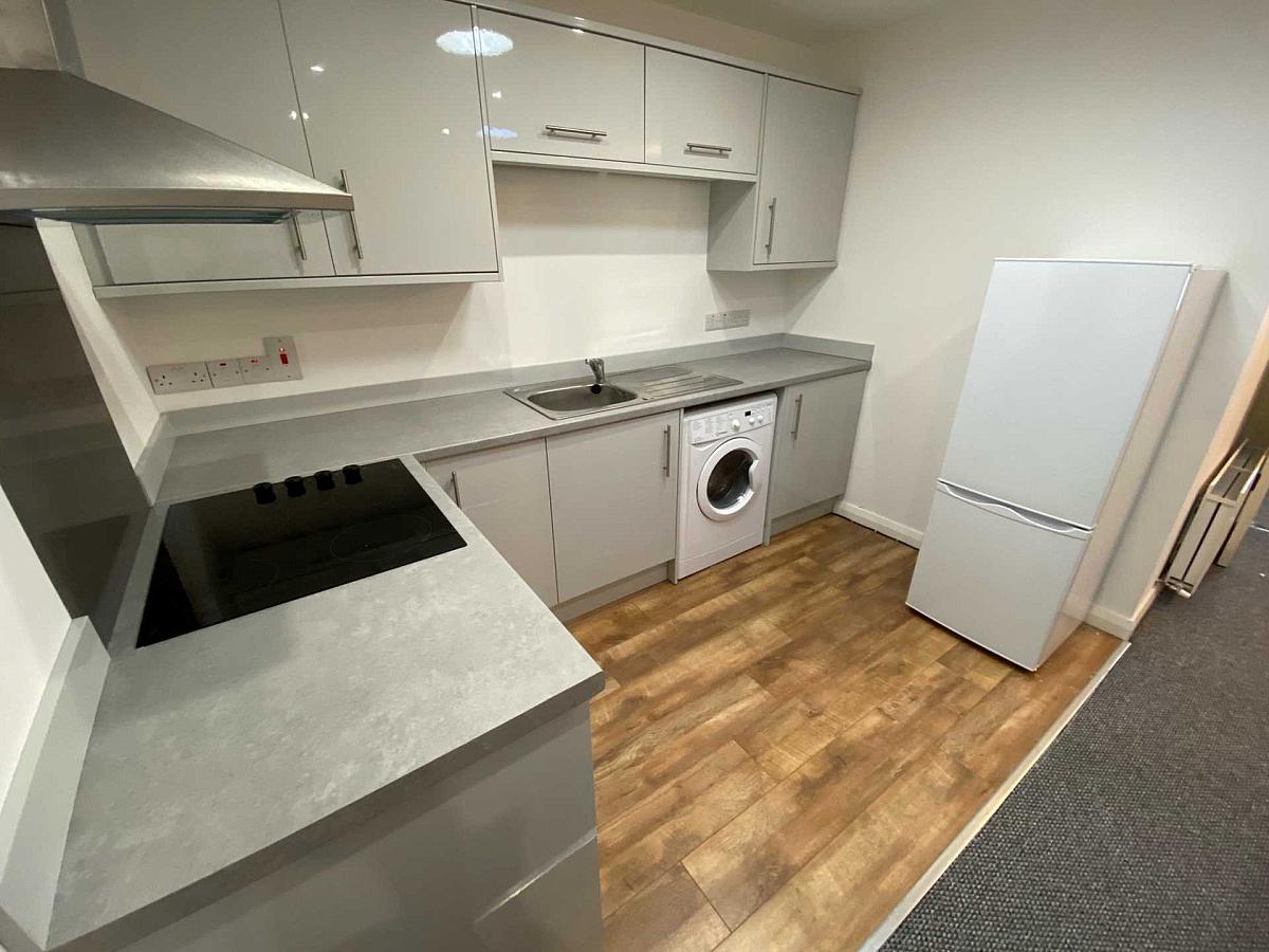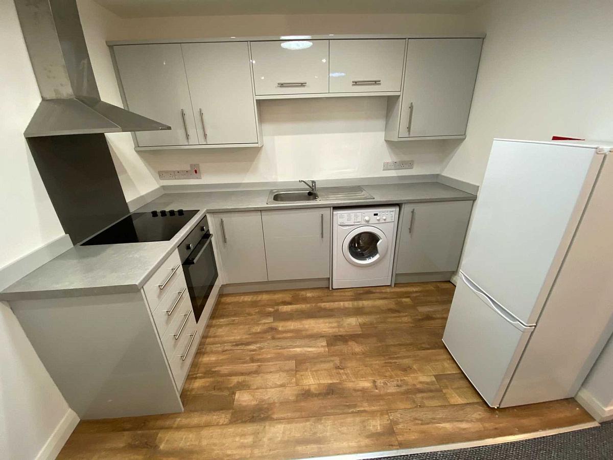 Open plan to modern fitted kitchen with appliances, neutrally decorated and wood effect vinyl flooring.
