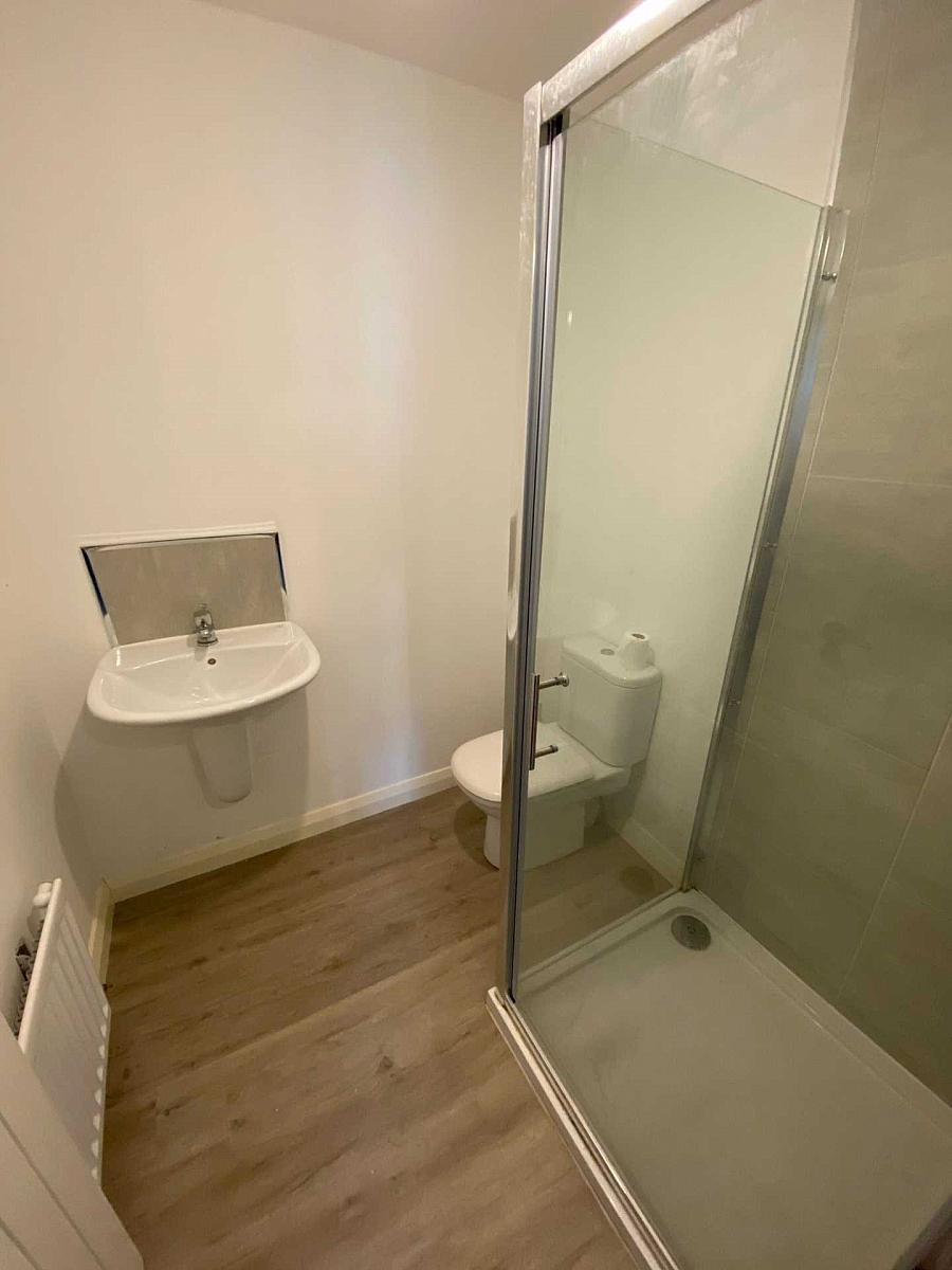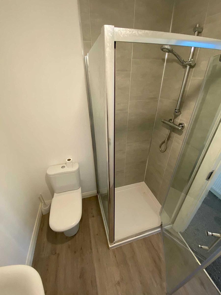 Bathroom with thermostatic shower-in-cubicle and white suite.