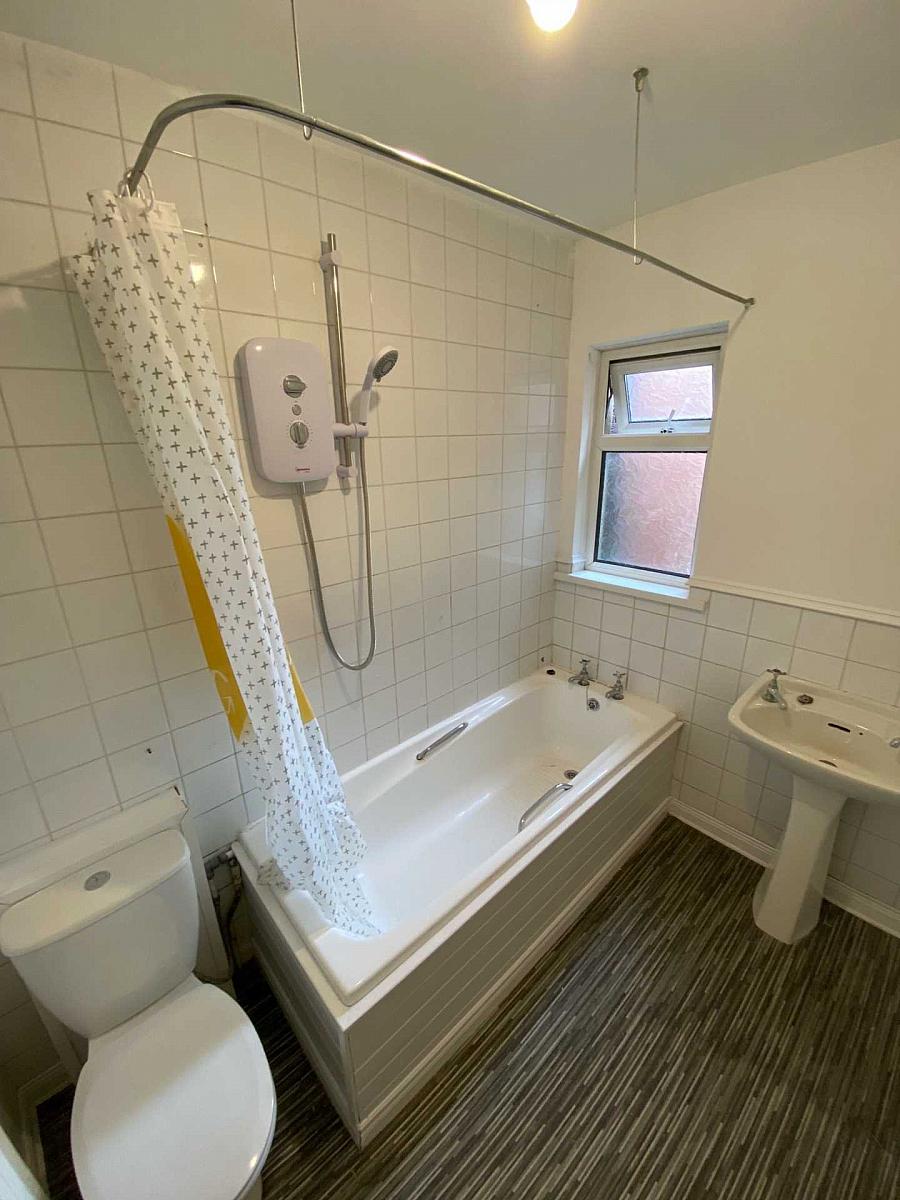 Family bathroom with white 3 piece suite and electric shower over bath.
