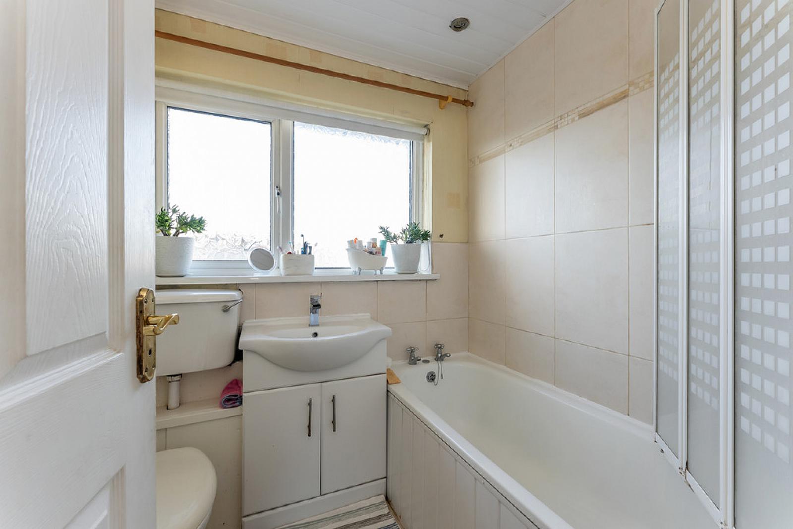 BATHROOM White suite panelled bath with Triton shower over, vanity unit with storage, low flush WC, tiled floor, part tiled walls.