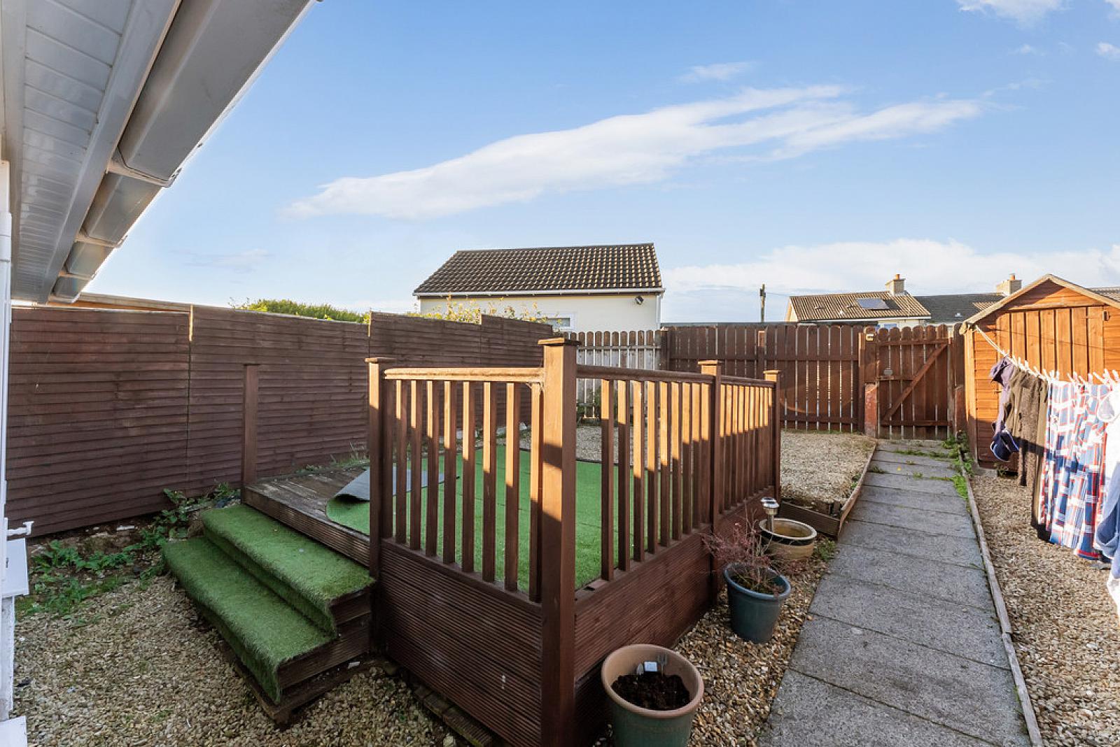 OUTSIDE Front garden in loose stones, enclosed rear garden in artificial grass with loose stones, garden fence and sitting area.