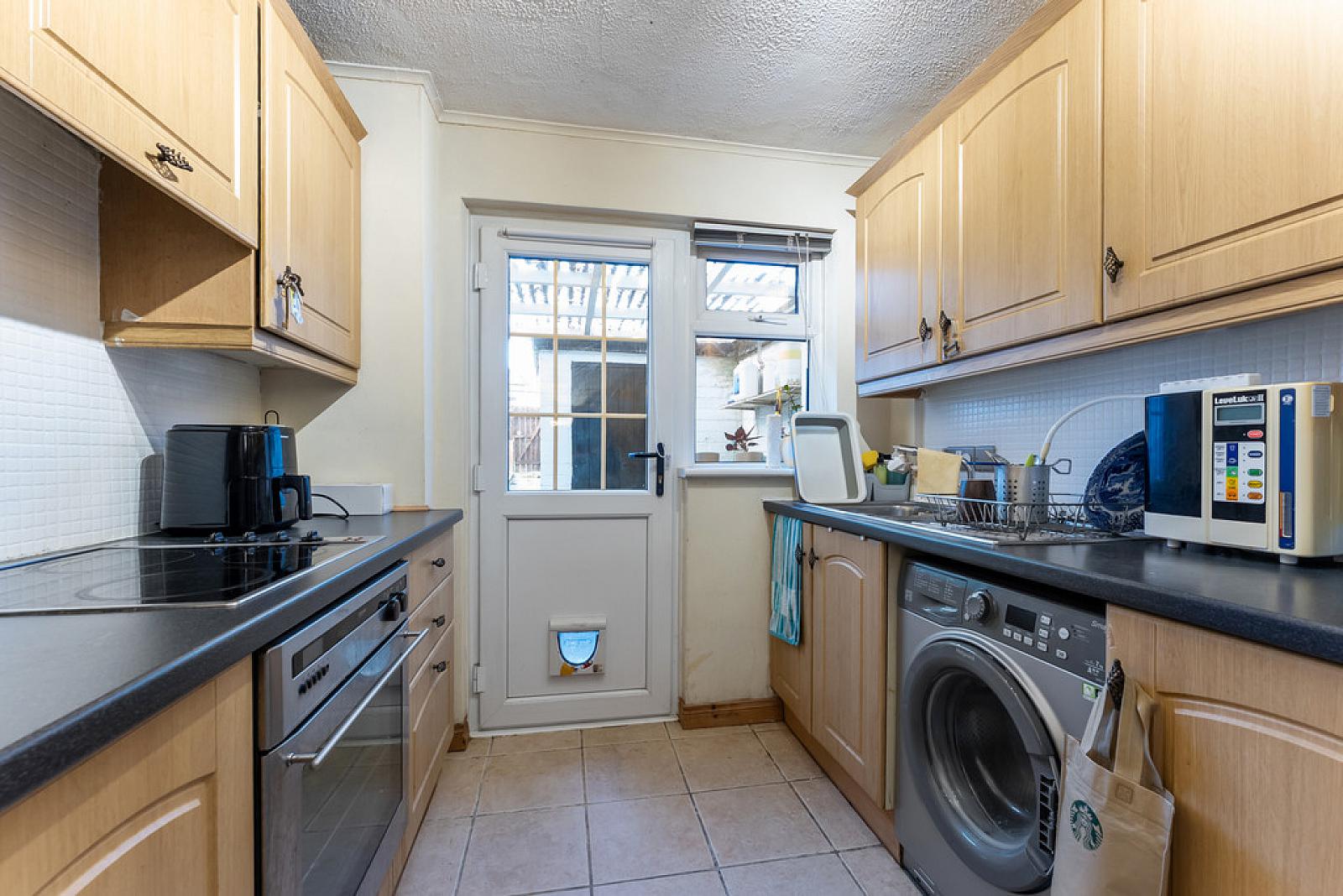 KITCHEN 7' 9" x 8' 6" (2.36m x 2.59m) Range of high and low level units, work surfaces, 1.5 bowl single drainer stainless steel sink unit with mixer tap, four ring hob with electric oven under, extractor fan over, plumbed for washing machine, tiled floor, part tiled walls, uPVC double glazed door to rear.