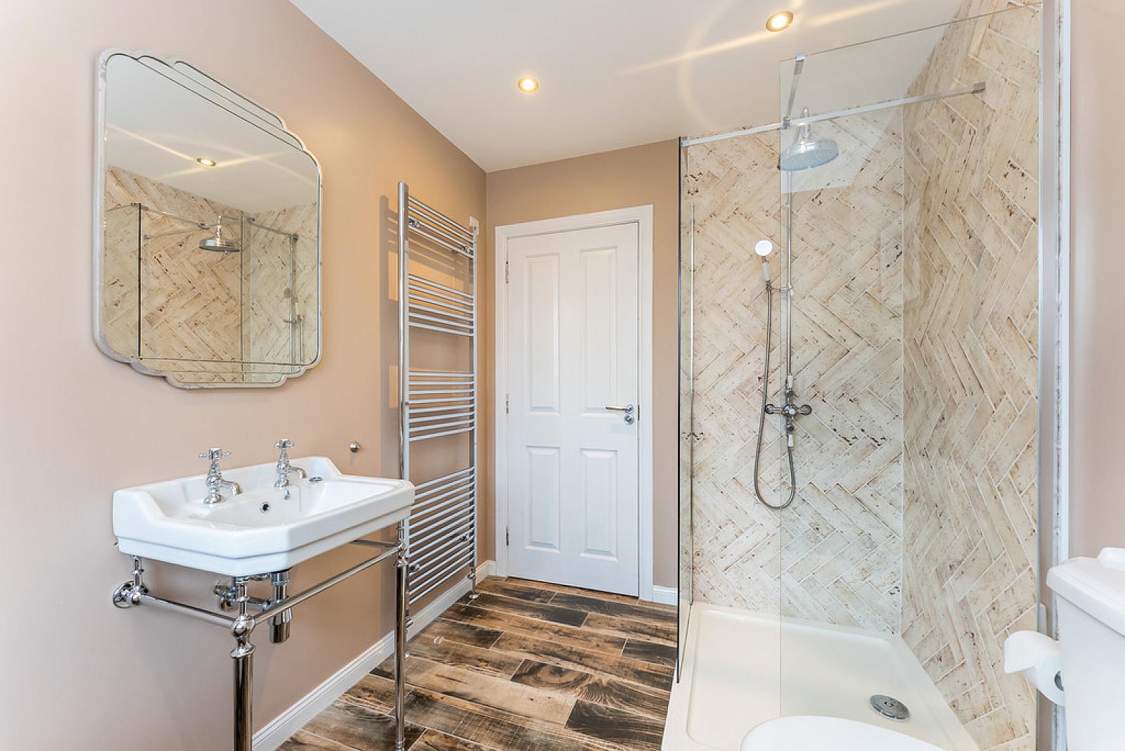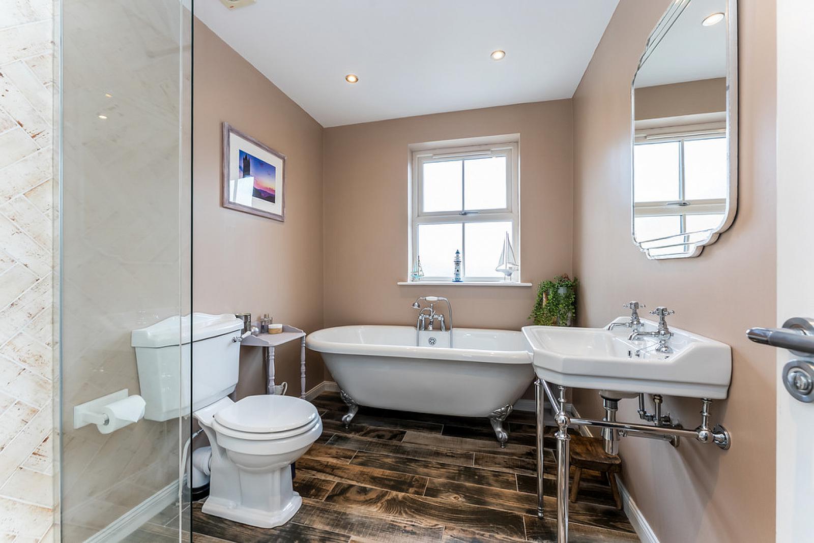BATHROOM White suite comprising free standing roll top bath with mixer tap and telephone hand shower, sink unit, low flush WC, tiled walk in shower cubicle with rainwater shower, chrome heated towel rail, wood effect tiled floor, low voltage spotlights, extractor fan.