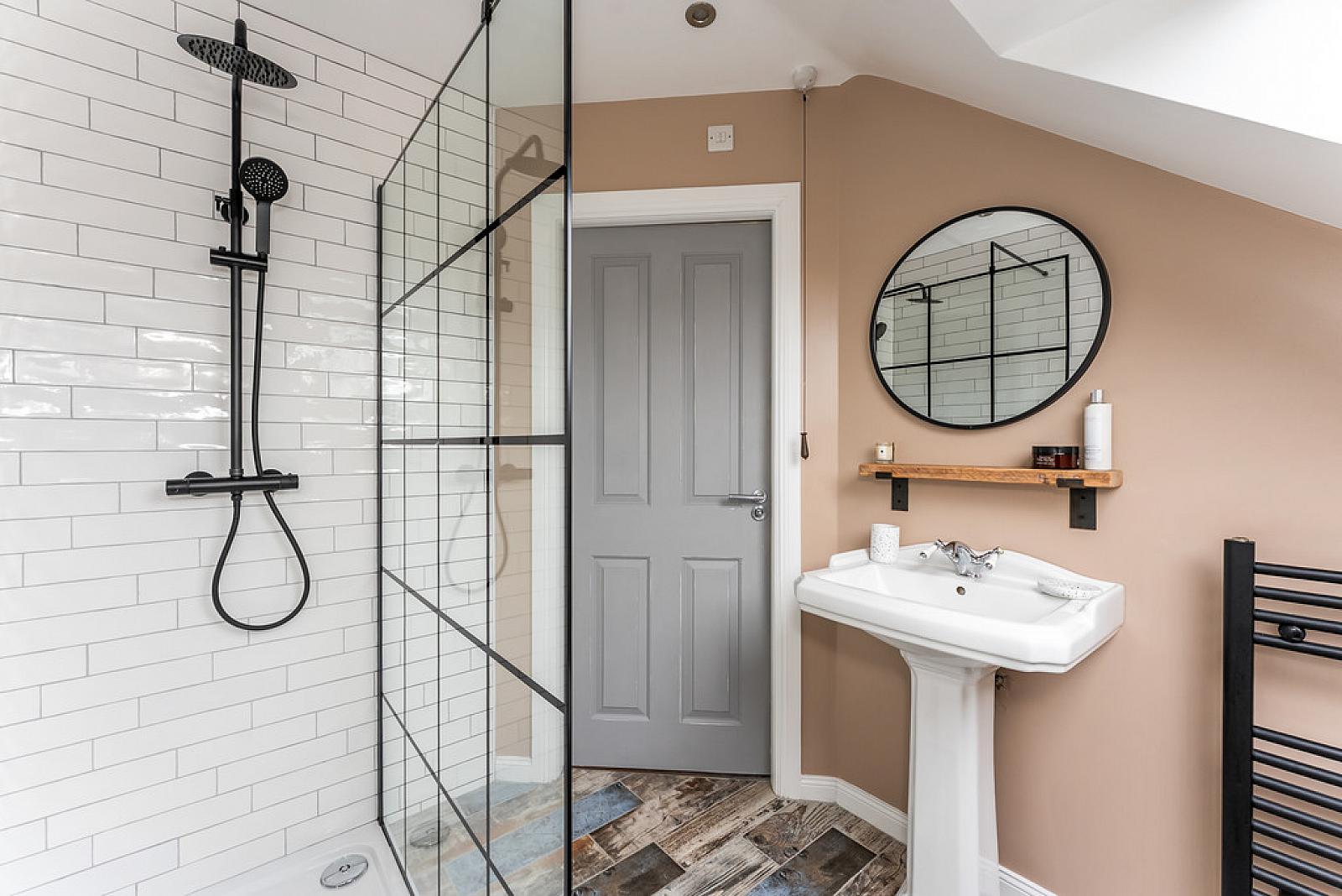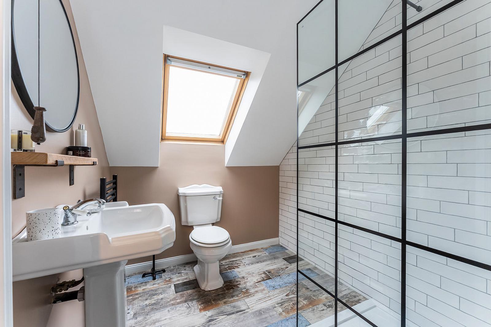 ENSUITE SHOWER ROOM White suite comprising low flush WC, pedestal wash hand basin, walk in shower cubicle with rainwater shower, Velux window, tiled floor, heated towel rail, low voltage spotlights, extractor fan.