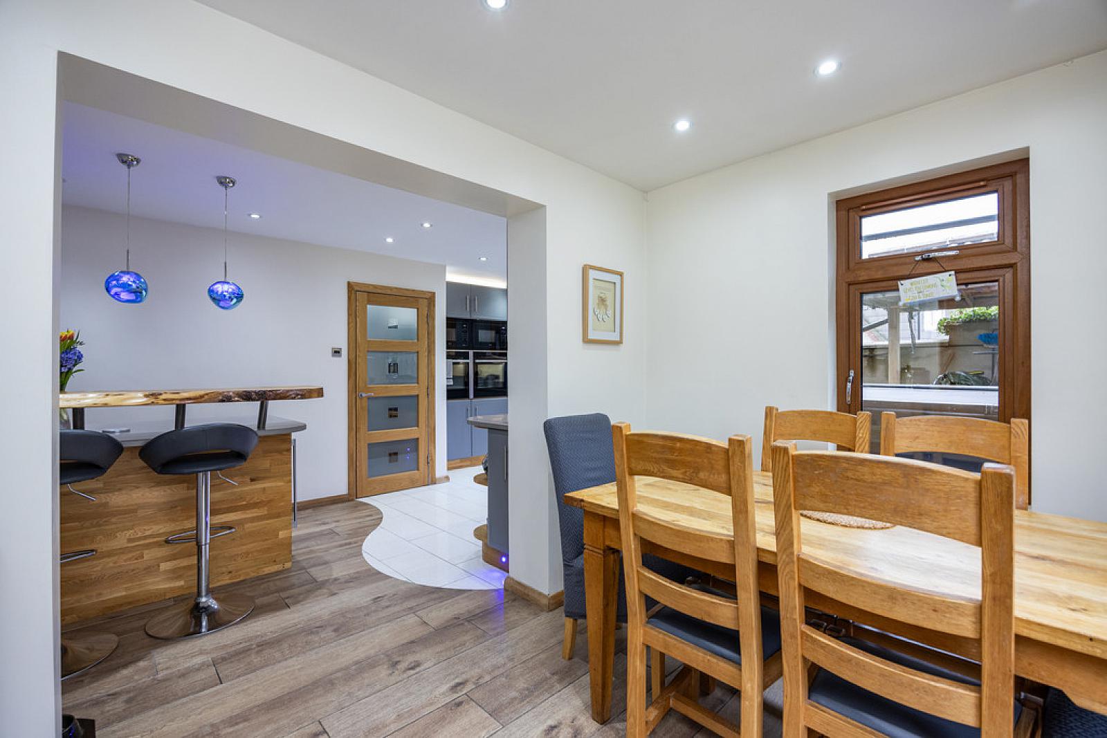 KITCHEN/LIVING/DINING 22' 11" x 17' 3" (7.01m x 5.26m) Contemporary modern fully fitted kitchen with excellent range of high and low level units with composite worktops, single drainer sink unit with mixer taps, five ring Neff induction hob with Neff extractor fan above, Neff slide and hide oven, built in microwave, Porcelain tiled floor, feature LED lighting, integrated Bosch dishwasher, low voltage spotlights. Open to dining area with raised breakfast bar with composite and solid oak timber worktops, incorporating a built in wine fridge, ceramic tiled floor, dual aspect windows, triple glazed uPVC oak effect French doors to garden, oak effect uPVC inner door to...