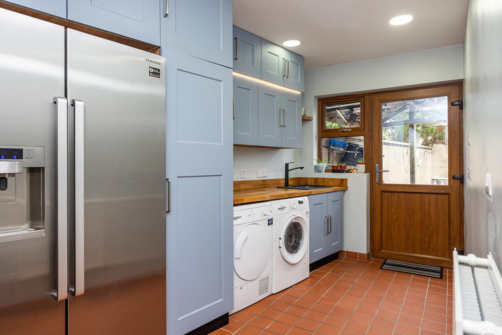 UTILITY ROOM 14' 9" x 7' 3" (4.5m x 2.21m) Range of high and low level units, American style fridge/freezer, single drainer sink unit with mixer taps, plumbed for washing machine, tiled floor, oak triple access door to rear garden.