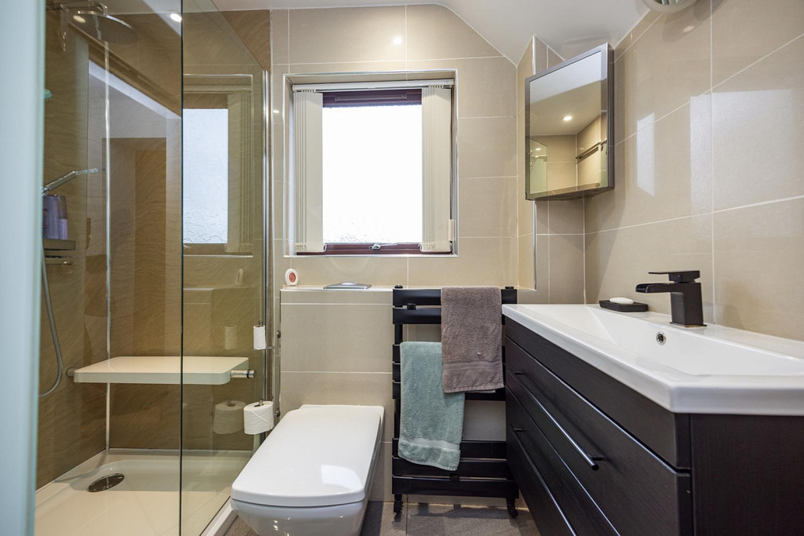 ENSUITE SHOWER ROOM White suite comprising wall hung wc, vanity sink unit with mixer tap, heated towel rail, walk in shower with chrome overhead shower unit, PVC panelled splashback, Porcelain tiled floor with electric underfloor heating, low voltage spotlights, extractor fan.