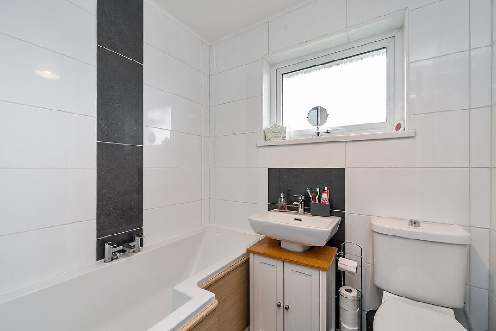 BATHROOM White suite comprising panelled bath with mixer tap with Mira shower over, pedestal wash hand basin, low flush WC, fully tiled walls, tiled floor.