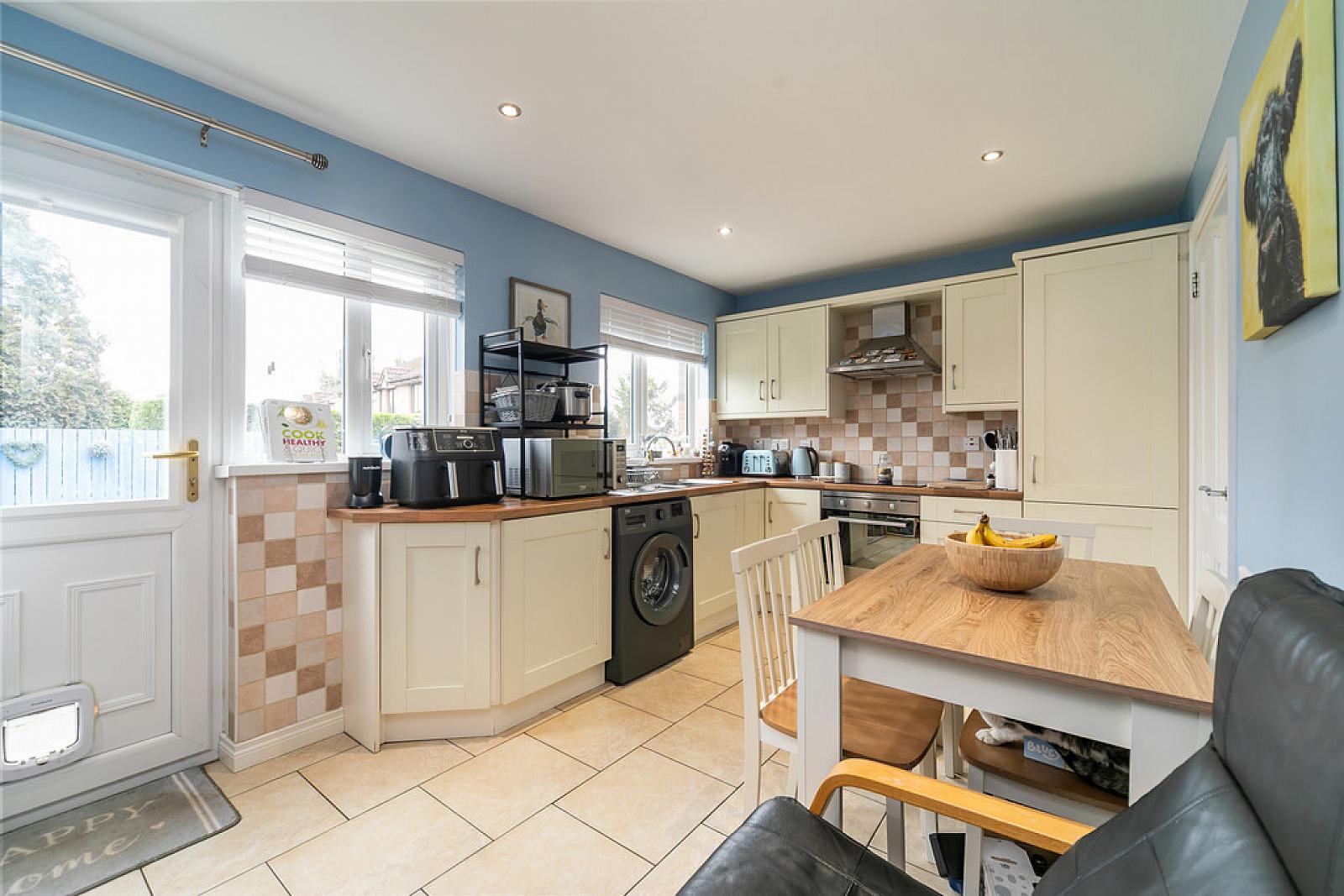 KITCHEN WITH BREAKFAST AREA 15' 6" x 9' (4.72m x 2.74m) Range of high and low level units, work surfaces, 1.5 bowl single drainer stainless steel sink unit with mixer tap, Belling four ring hob with electric oven under, extractor fan over, plumbed for washing machine, part tiled walls, tiled floor, integrated fridge and freezer, low voltage spotlights, pantry/under stairs storage, uPVC double glazed door to rear.