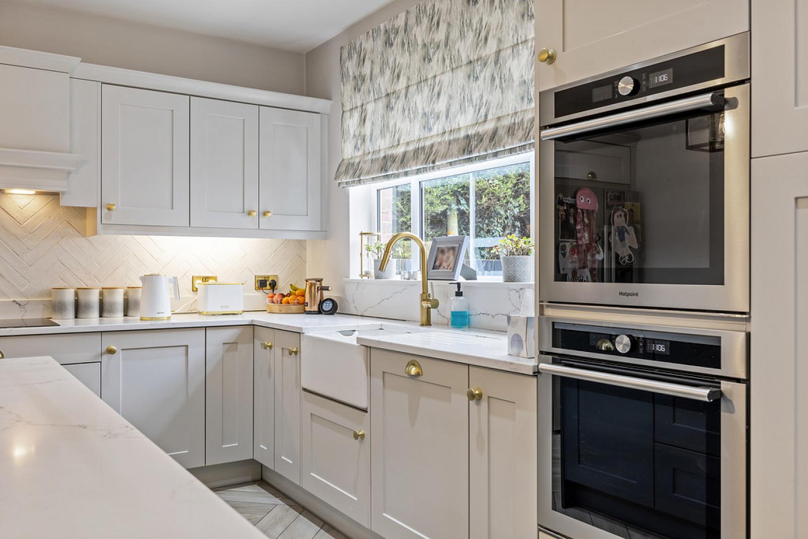 OPEN PLAN KTICHEN / DINING 28' 4" x 12' 4" (8.64m x 3.76m) Range of fitted high and low level units, quartz work surfaces and upstand, Belfast sink unit with mixer tap, four ring integrated hob, concealed extractor fan, tiled splashback, twin integrated ovens, integrated dishwasher, plumbed for American styled fridge freezer, island unit with quartz work surfaces, recessed low voltage spotlights.