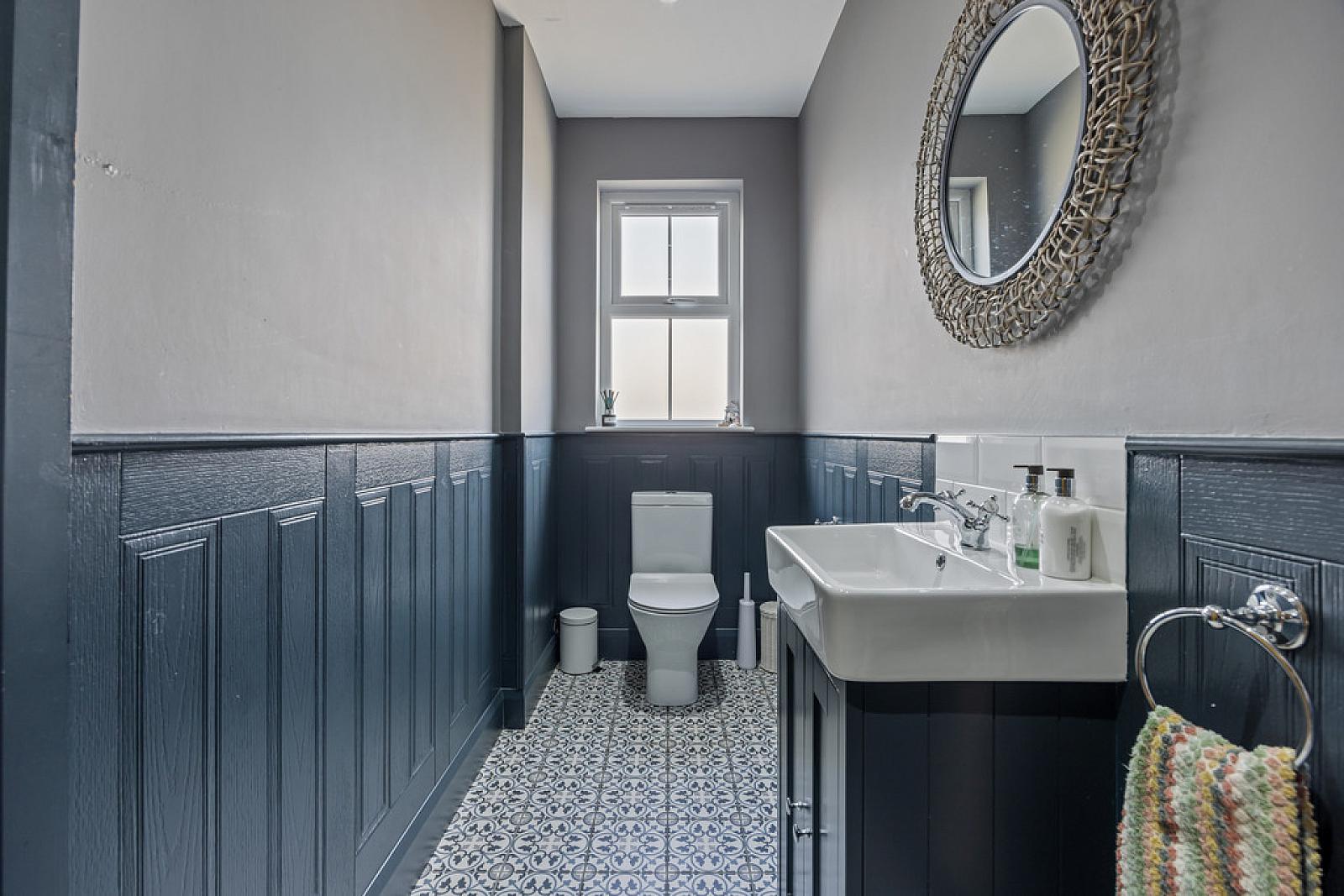 WC / CLOAKROOM Low flush WC, vanity wash hand basin, tiled floor, part timber panelled walls, recessed low voltage spotlights, extractor fan.