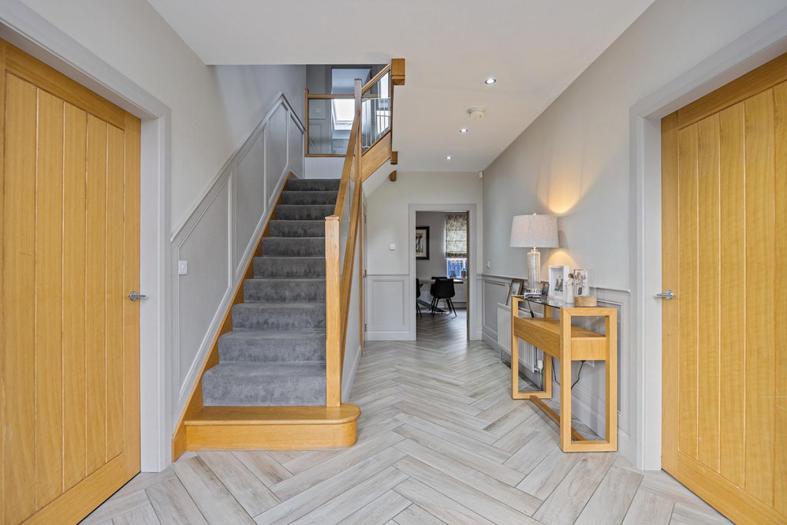 RECEPTION HALL Tiled floor, stairs to first floor, part timber panelled walls, under stairs storage cupboard, recessed low voltage spotlights.
