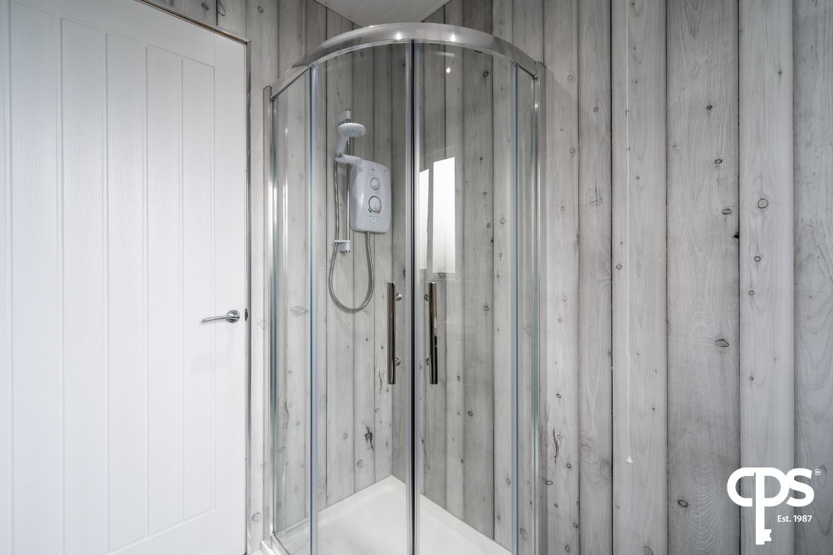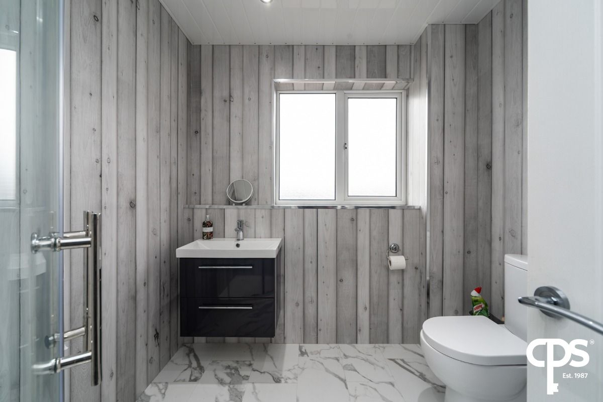 Contemporary family bathroom comprising a modern three-piece suite including corner shower, WC and wash hand basin, complete with stylish marble effect flooring.
