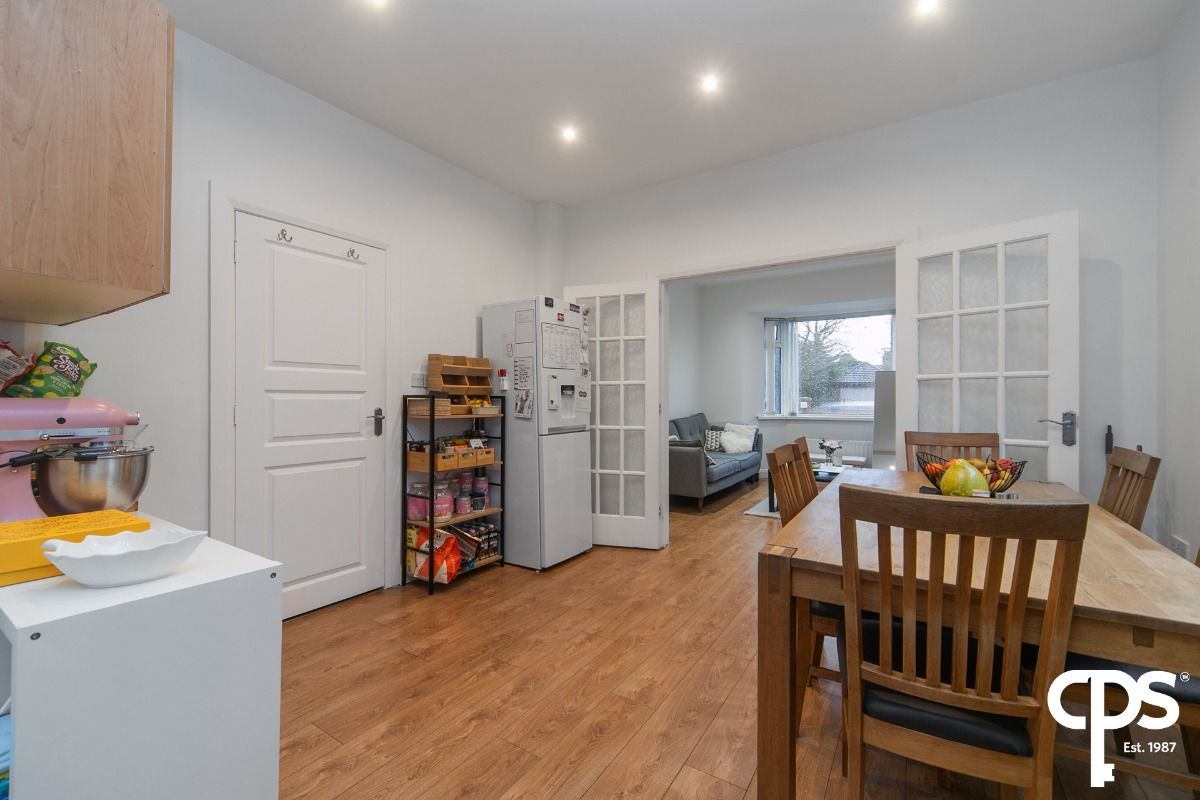 Laminate wooden flooring with double doors leading to the kitchen/dining area.