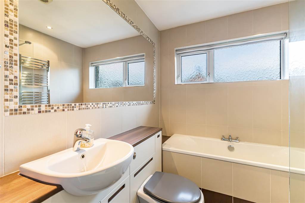 Modern white bath with central mixer tap. Walk-in shower cubicle. Vanity wash hand basin. Upright chrome radiator. WC. Tiled walls with inset mirror. Ceiling downlighters.
