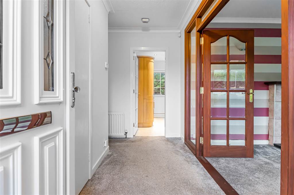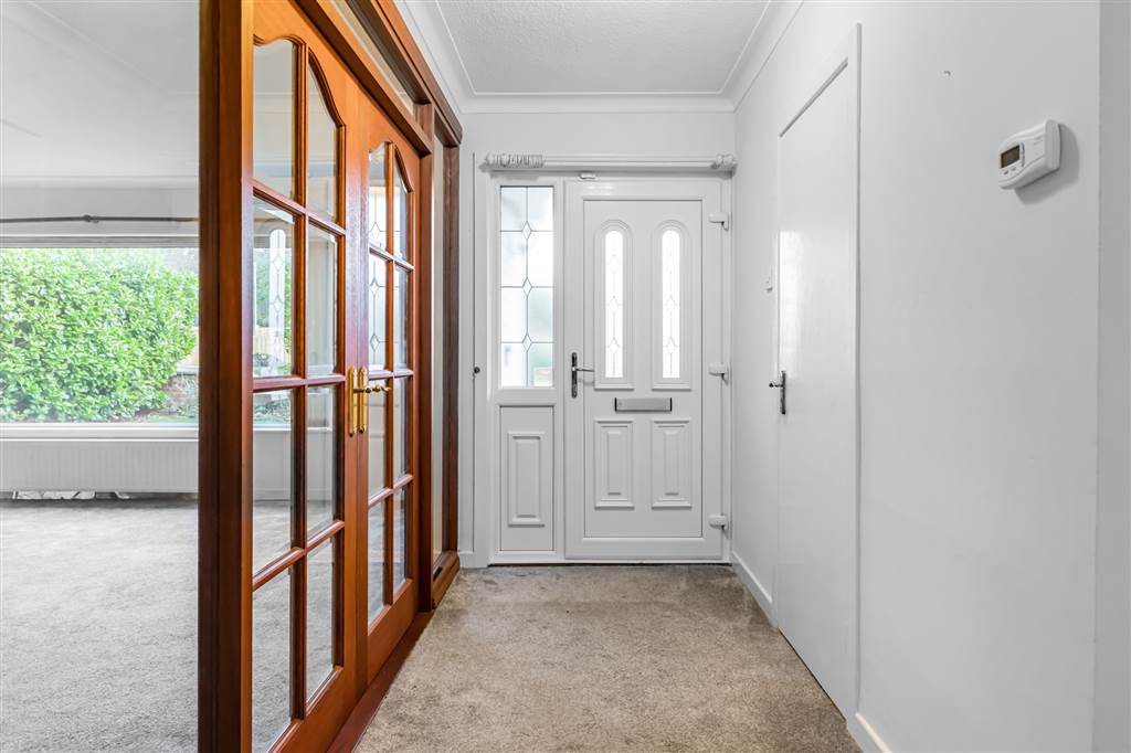 PVC partly glazed entrance door with matching side panel. Cloakroom with glazed panelled wall with twin glazed doors to: