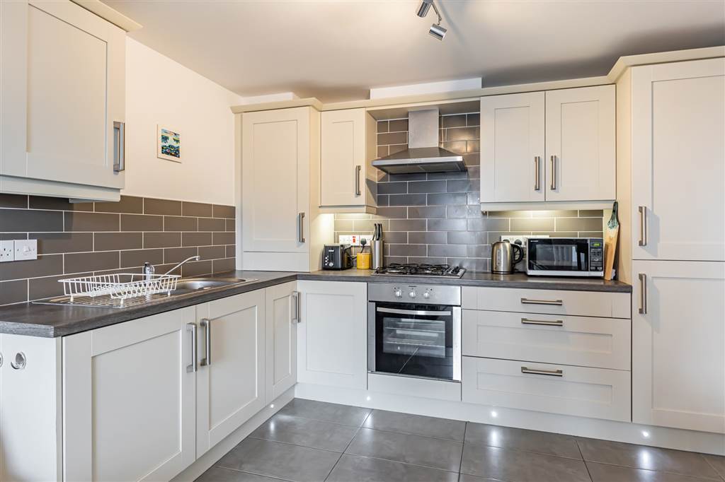 Range of high and low level off grey units with contrasting wood effect worktop. One and a half stainless steel sink units with mixer tap and drainer. Built-in electric oven. 4 ring gas hob with stainless steel extractor fan. Integrated fridge freezer. Tiled between units. Tiled floor in kitchen area. Kickboard LED lighting. TV and telephone point.