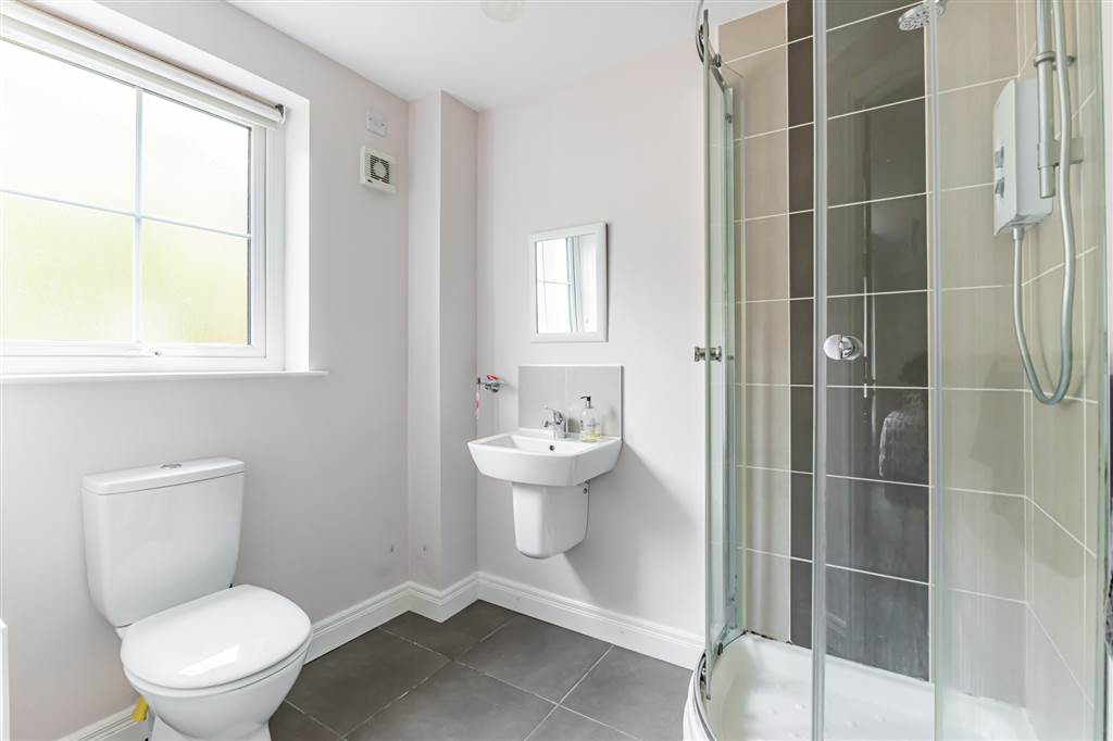 Fully tiled corner shower with electric shower unit. Floating sink unit with mixer tap and tiled splashback. Low flush WC. Tiled floor. Extractor fan.