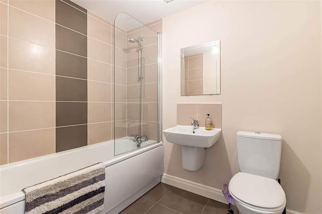 White suite comprising of panelled bath with mixer tap and telephone shower attachment. Shower screen. Floating sink unit with mixer tap and tiled splashback. Low flush WC. Tiled around bath. Tiled floor. Extractor fan.