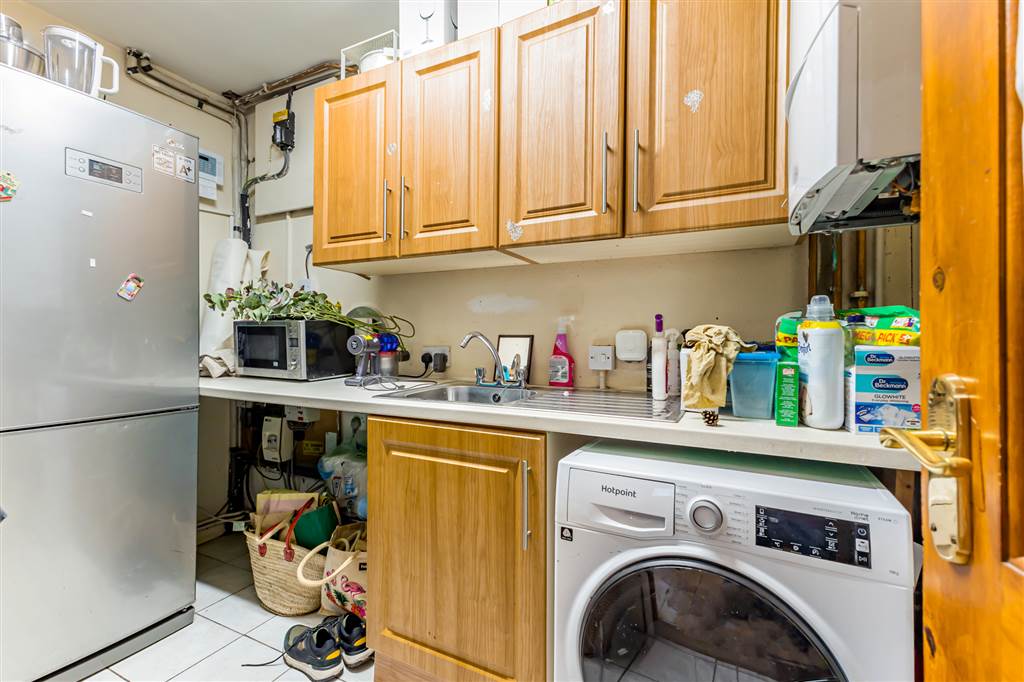 Range of high and low level units with worktop. Stainless steel sink unit with mixer tap. Plumbed for washing machine. Gas boiler. Coathooks. Tiled floor.