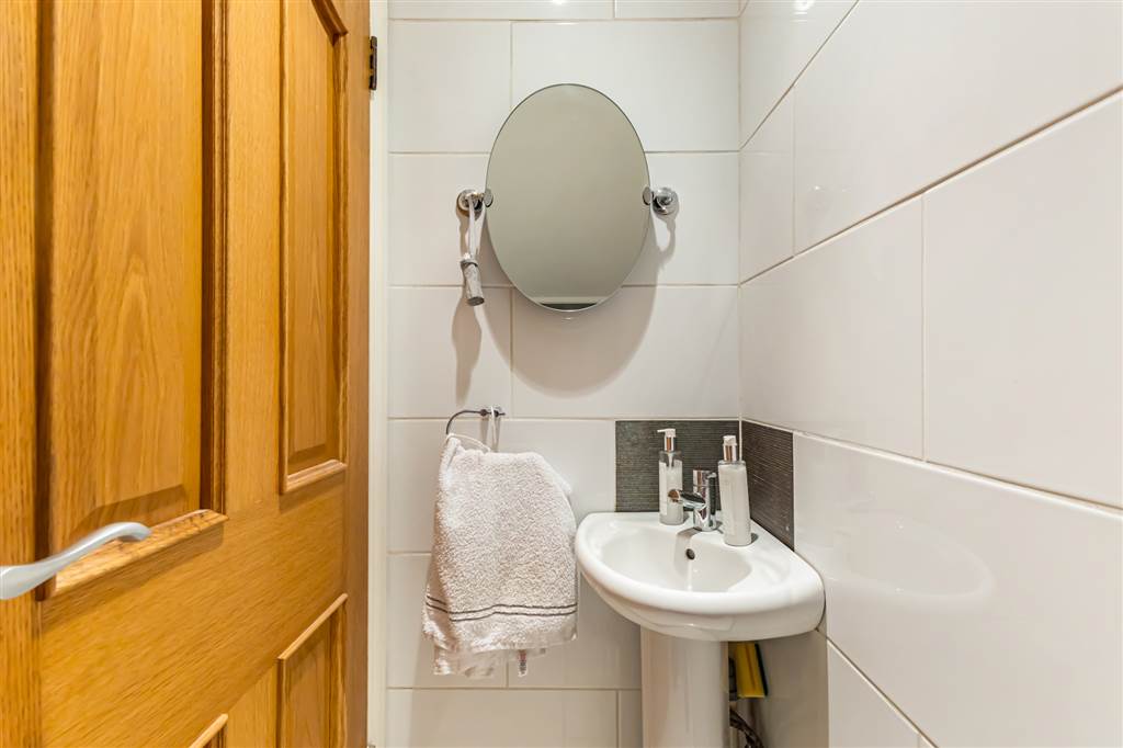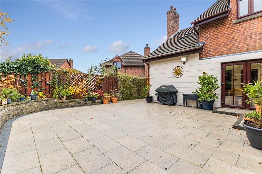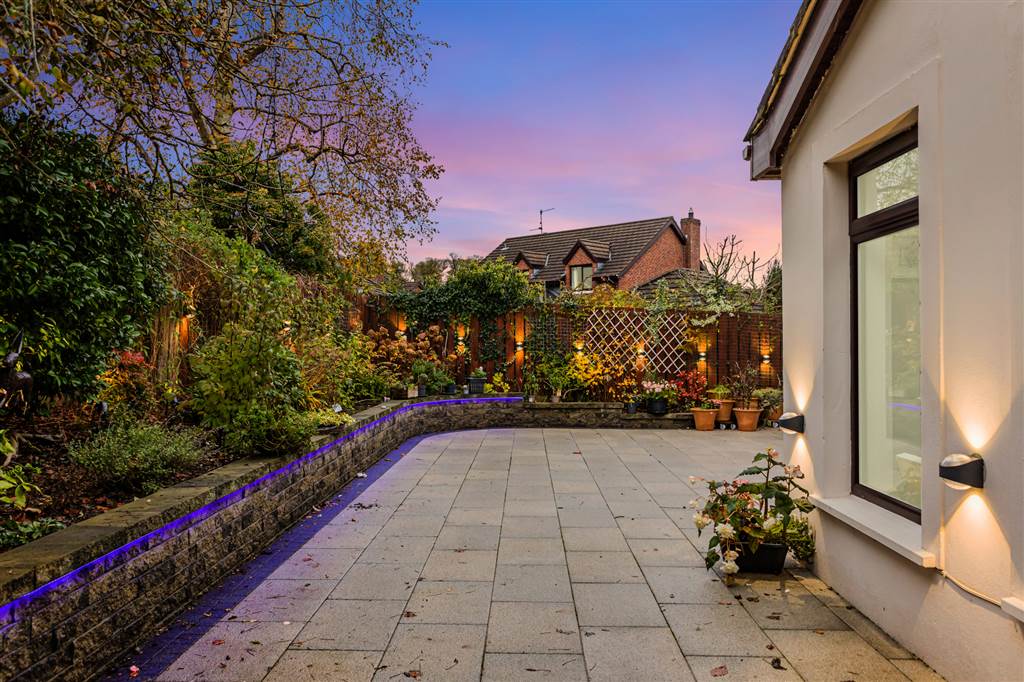 Enclosed private and mature rear garden with extensive paved area with raised tree and shrub area to boundaries. Timber fencing. An evening/night time feature is the external lighting. Garden shed/workshop with power. Outside water tap.