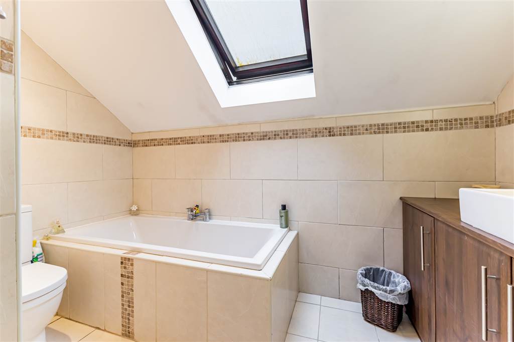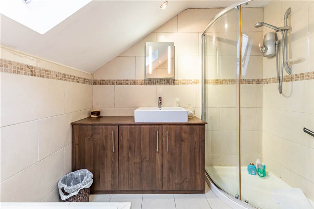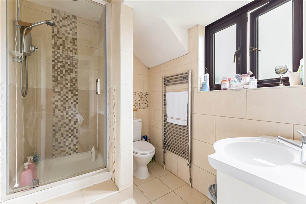 Ensuite Shower room with raised shower cubicle with electric shower. Vanity wash hand basin with mixer tap. WC. Tiled walls and floor. Upright chrome radiator.