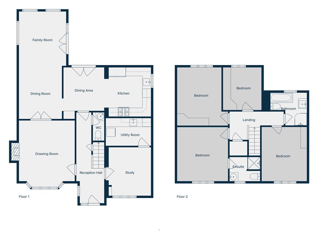 Ground Floor - Reception hall with cloakroom (WC and wash hand basin) , drawing room with feature marble fireplace leading to open plan formal dining room and family room, fitted kitchen with dining room, study and utility room.