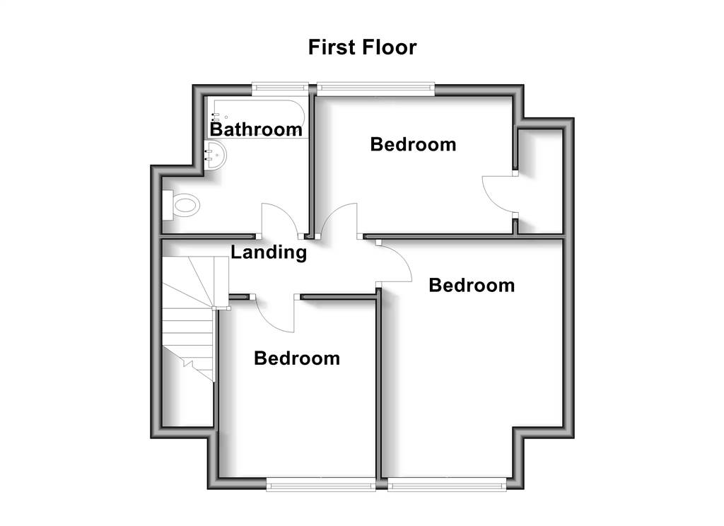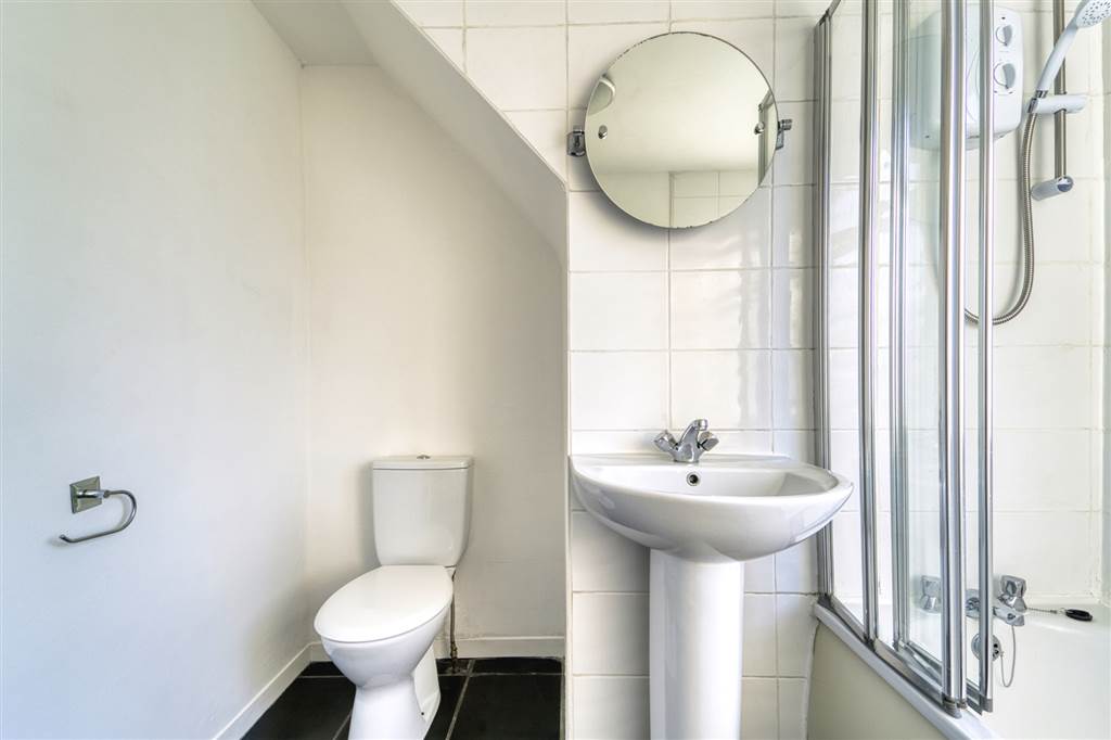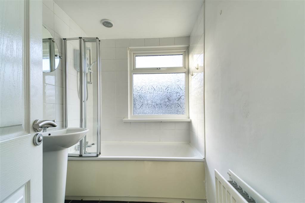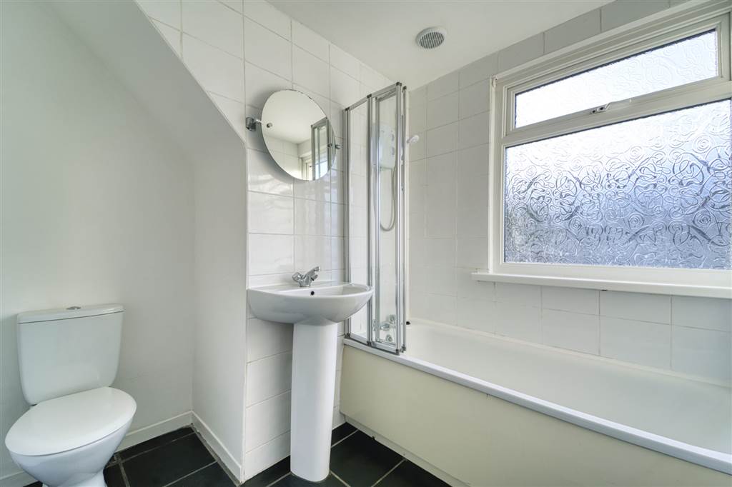White suite comprising of panelled bath with mixer taps and 'Triton' electric shower unit over bath. Folding shower screen. Pedestal wash hand basin with mixer tap. Low flush WC. Part tiled walls. Tiled floor. Extractor.