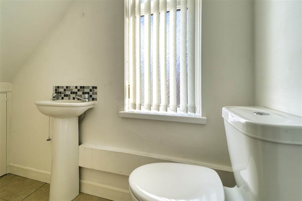 Low flush WC, pedestal wash hand basin and tiled splashback. Tiled floor.