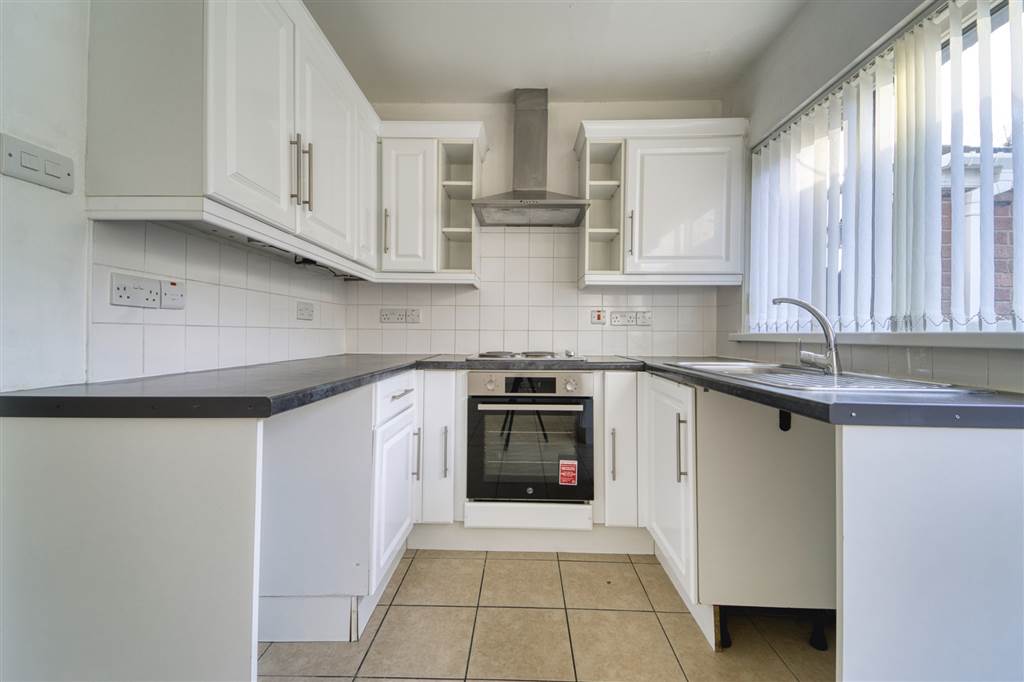 Range of high and low level white unites with contrasting granite effect worktops. Stainless steel sink unit with mixer tap and drainer. Built-in electric oven and 4 ring hob with stainless steel extractor over. Plumbed for washing machine. Tiled between units. Tiled floor. Recessed spotlights. PVC double glazed rear door.