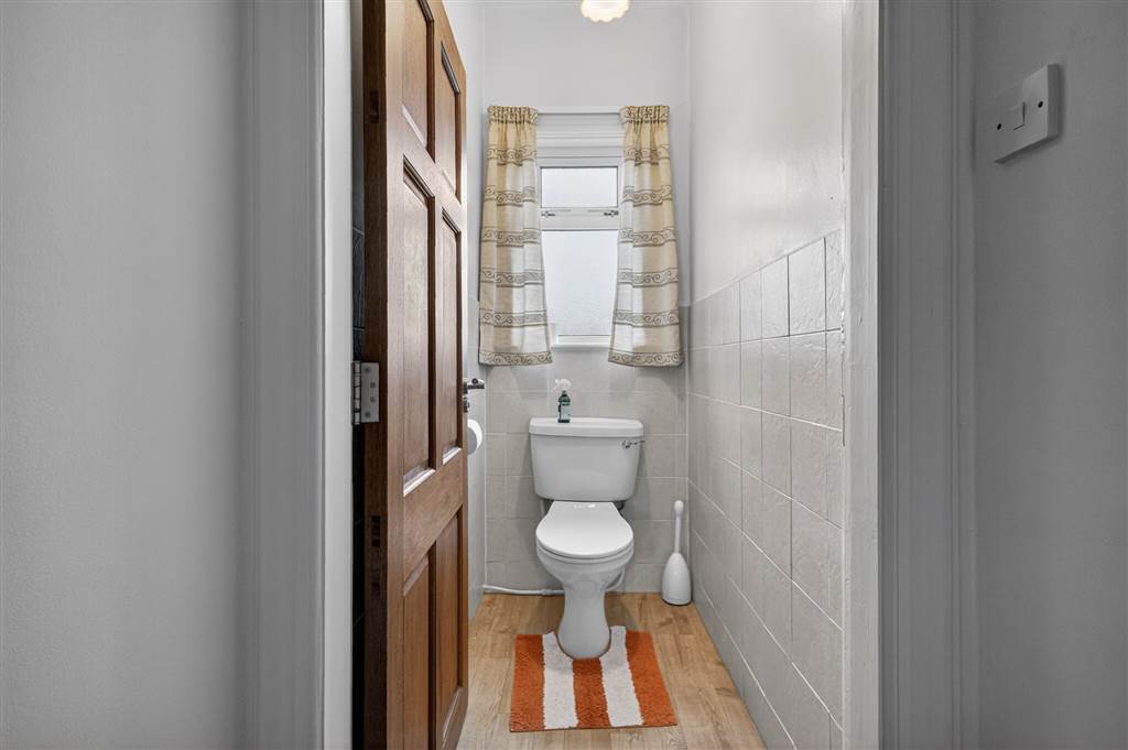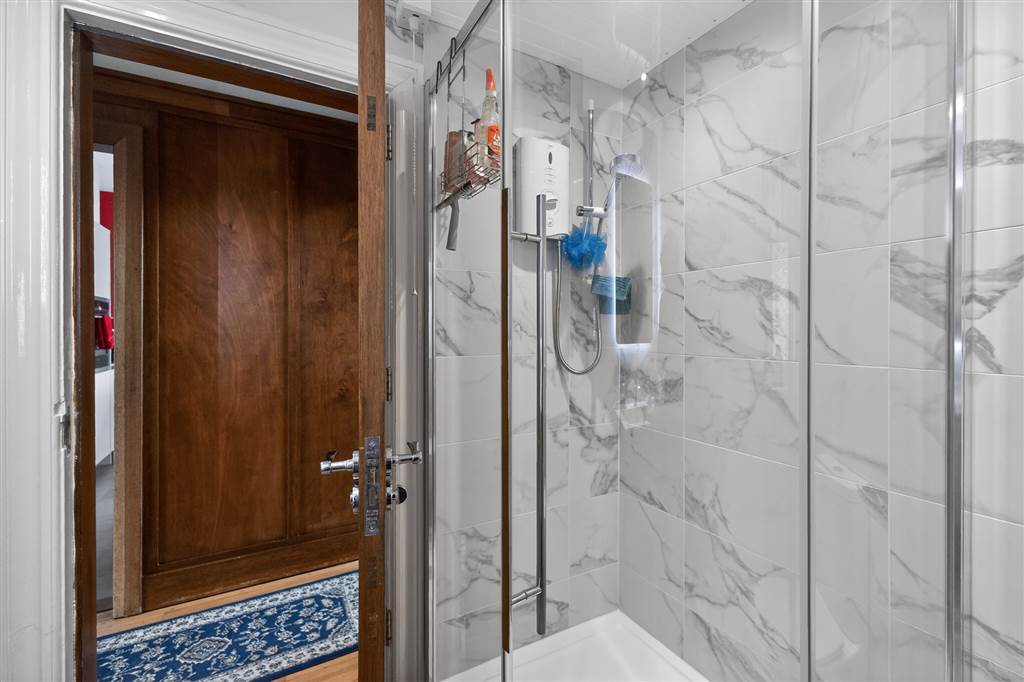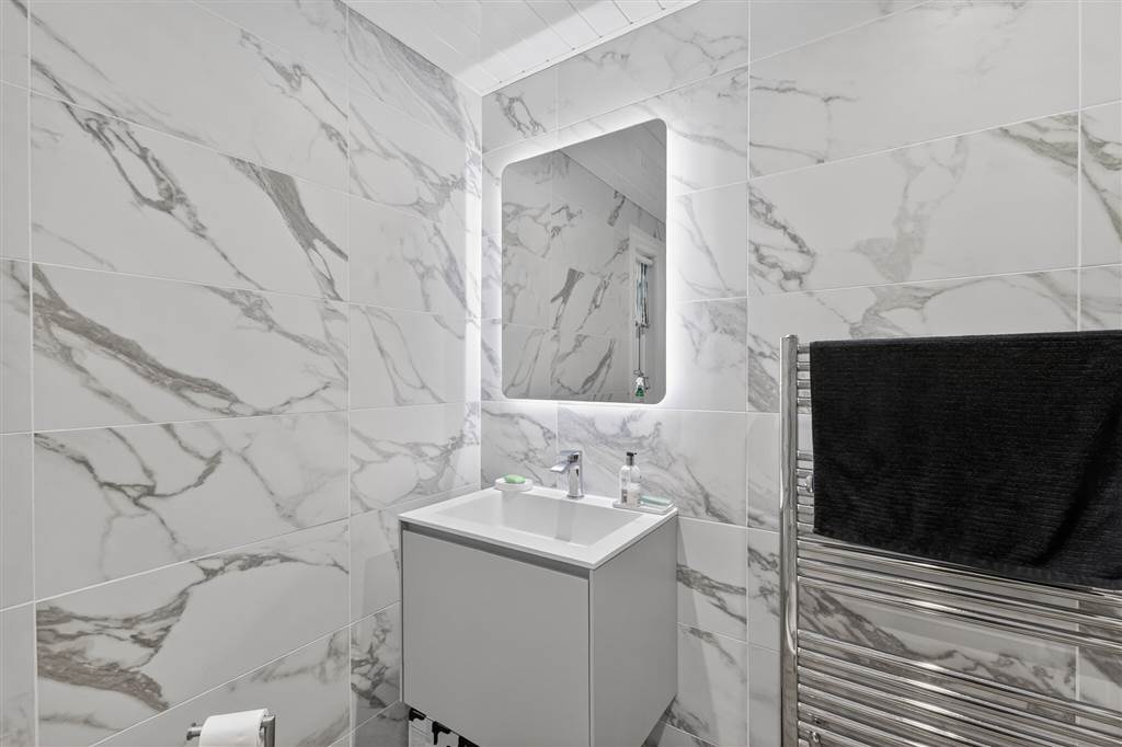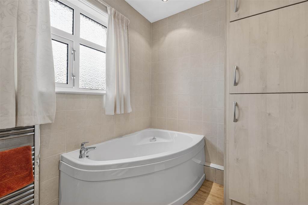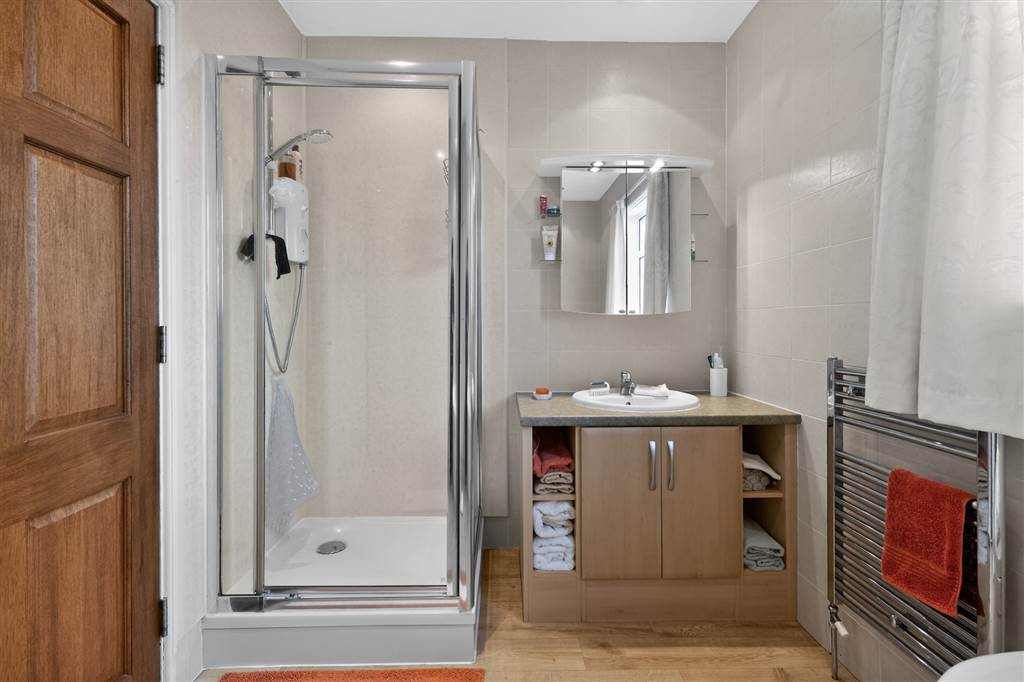 Corner bath with mixer tap. Shower cubicle with Mira Sport electric shower. Sheeted wall panelling to shower. Tiling to remaining walls. Vanity wash hand basin with mixer tap. Heated chrome towel rail. Ceiling downlighting.