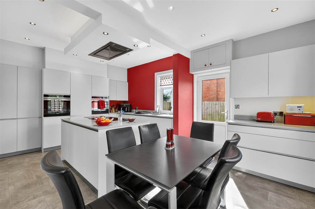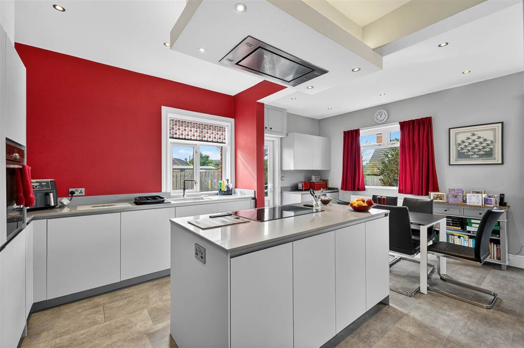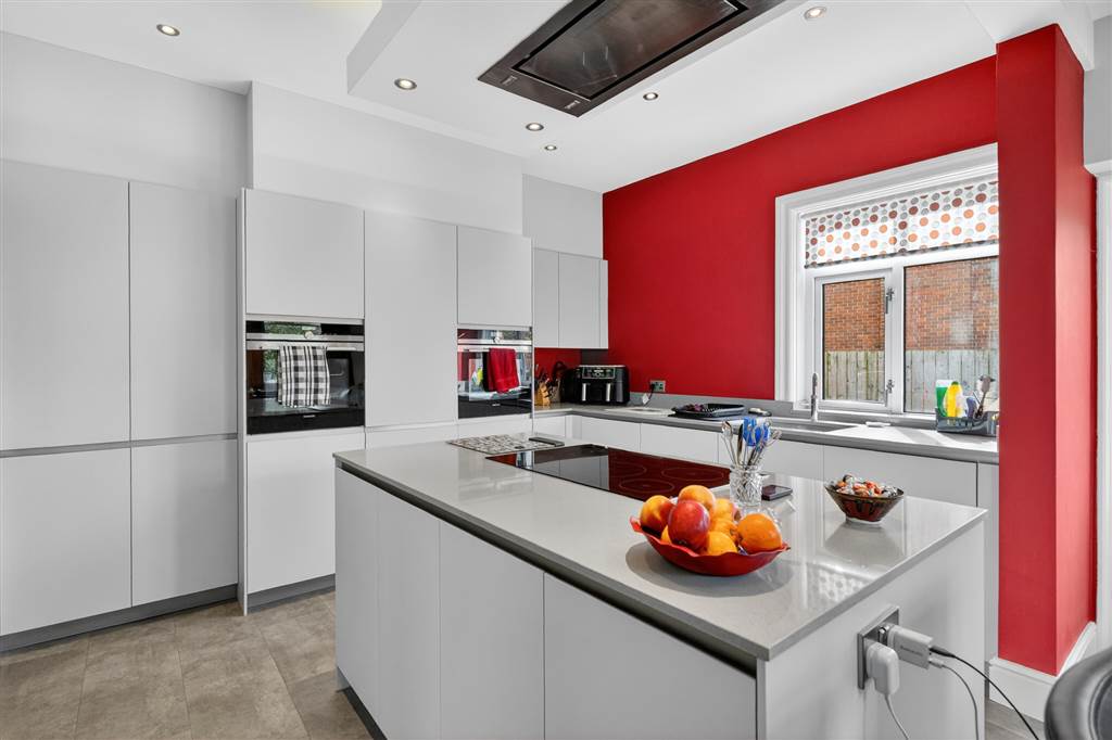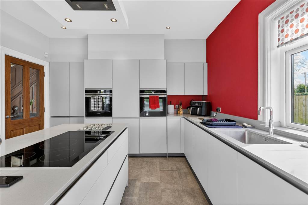 Extensive range of high and low level units with white doors and grey quartz worktops and upturns. Matching island unit. Siemens induction hob with stainless-steel extractor over - remote control. Centre ceiling downlighting. Inset Franke stainless steel sink unit, 'quooker' mixer tap. Microwave. Siemens integrated self-cleaning oven with matching Bosch dishwasher, pullout bin unit. Siemens washing machine. Second Siemens integrated oven.