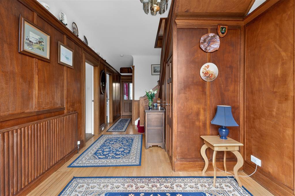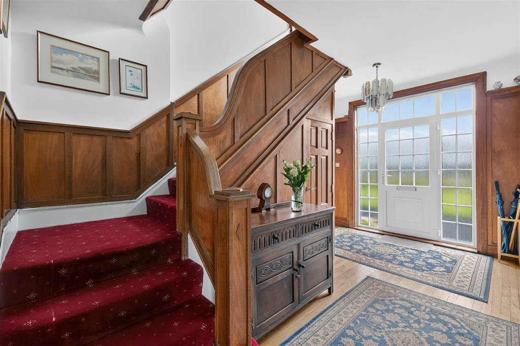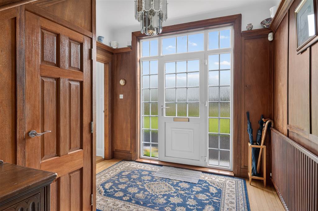 Hardwood strip flooring. Panelled walls with high level display shelf. PVC partly glazed entrance door and matching side panels. Cloaks cupboard under stairs.