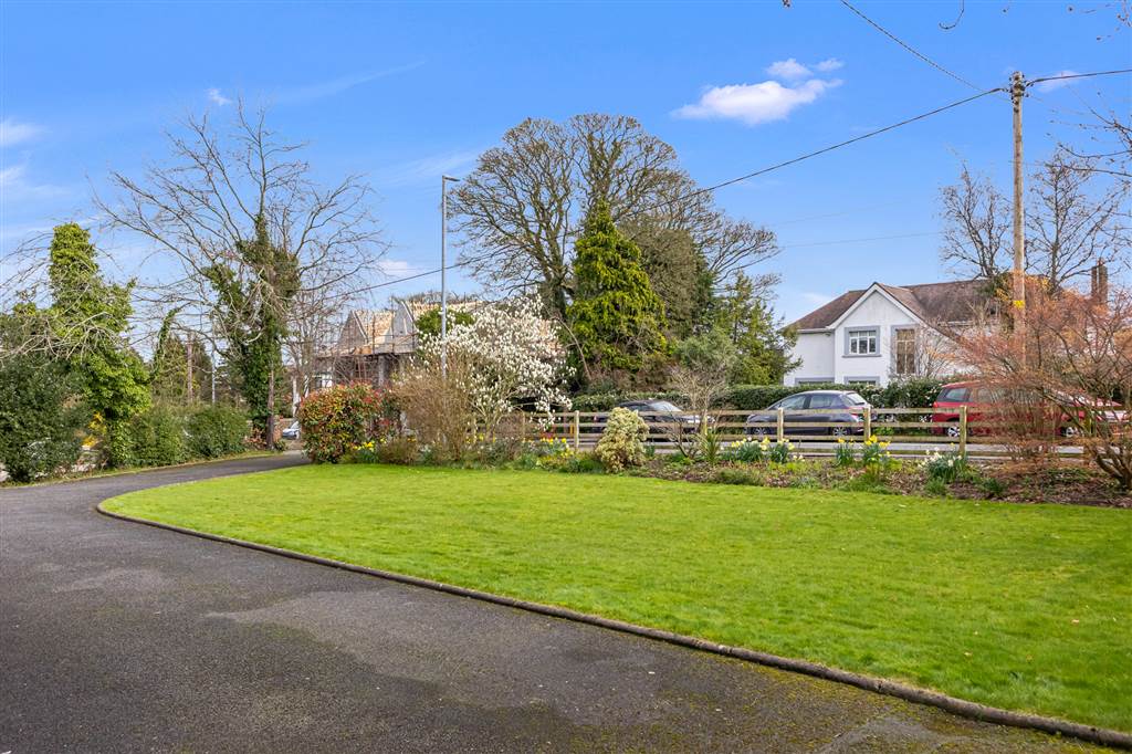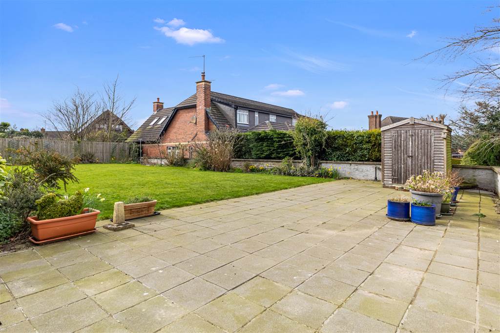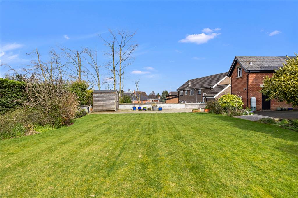 Level mature grounds in mature lawn well sheltered by mature trees and shrubs. Large paved patio area at rear with garden shed.